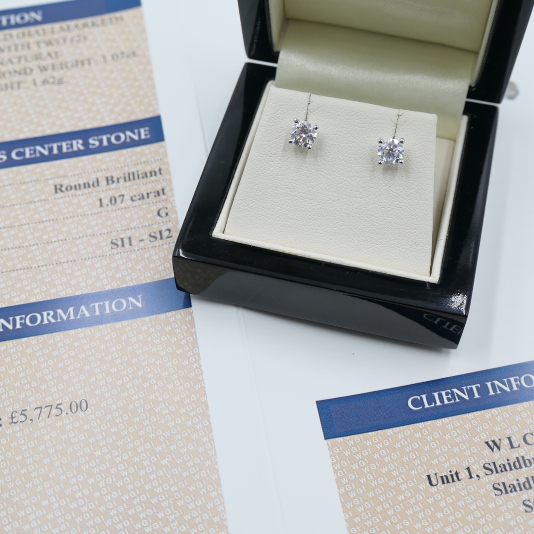 A brand new, unused certified pair of natural diamond solitaire earrings that capture the essence of timeless luxury and brilliance. Each earring is adorned with a stunning, brilliant-cut natural diamond, totalling 1.07 ct. The diamonds are graded G–H in colour and SI1–SI2 in clarity, displaying exceptional fire, sparkle and balance — a perfect blend of natural beauty and expert craftsmanship. Set in luminous 18ct white gold, the metal's calm tone enhances the diamonds’ radiant glow, creating a refined, contemporary look. With a total weight of 1.62 grams, these earrings offer both elegance and comfort, complementing any occasion with effortless sophistication.
