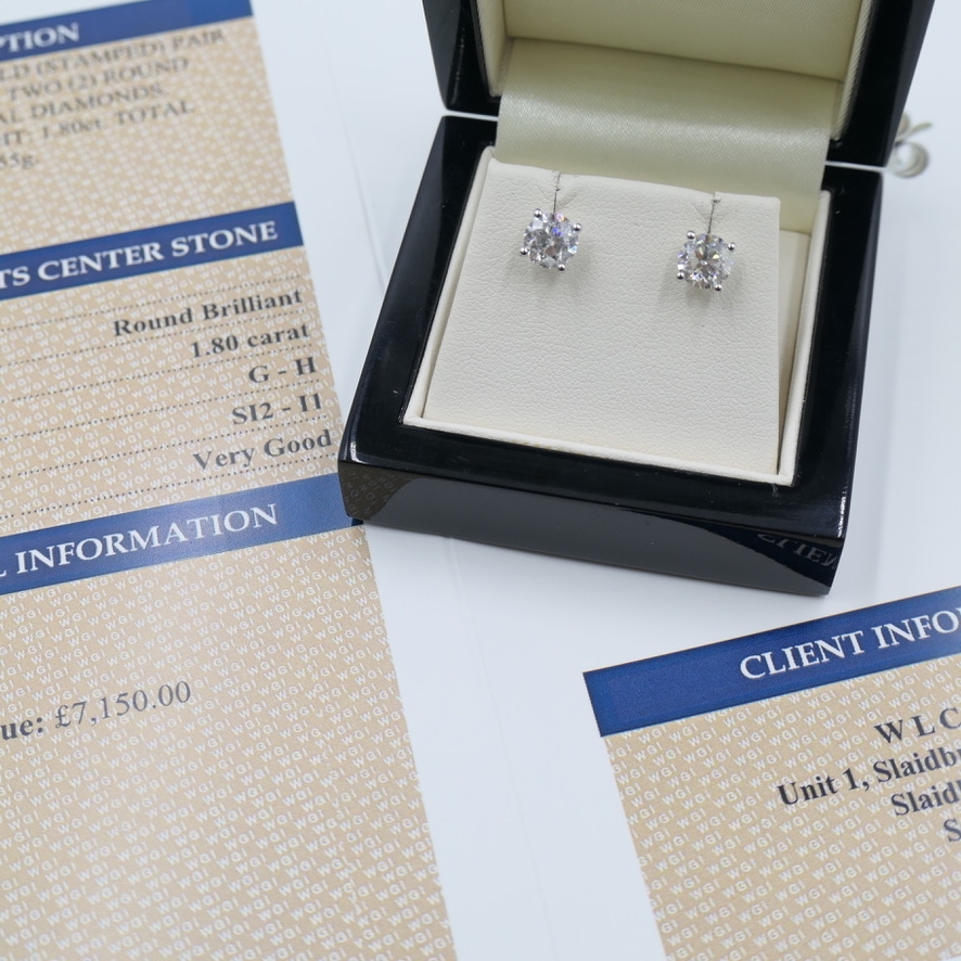 A brand-new, unused certified pair of natural diamond solitaire earrings, beautifully crafted in 18ct white gold. Each earring features a single brilliant-cut natural diamond, together weighing an impressive 1.80 carats, exuding a captivating sparkle that reflects timeless elegance and sophistication. The diamonds, graded G-H in colour and SI2–I1 in clarity, display a lively brilliance that catches the light from every angle, radiating a pure, natural beauty found only in earth-formed stones. The sleek white gold setting enhances their luminosity, keeping the diamonds the focal point in a classic, refined design that will never go out of style.