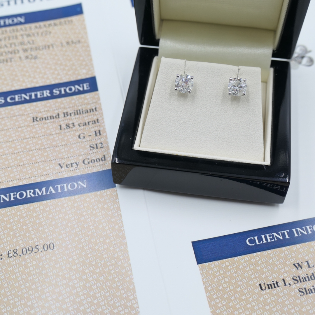 A brand-new, unused, certified pair of natural diamond solitaire earrings, this striking duo embodies timeless elegance and exceptional craftsmanship. Each earring showcases a stunning, brilliant-cut natural diamond, together weighing an impressive 1.83 carats. Graded G–H in colour and SI2 in clarity, the diamonds exude a captivating sparkle, radiating brilliance and fire with every movement. Their perfectly cut facets reflect light beautifully, enhancing the natural purity and luminosity of these exquisite stones.