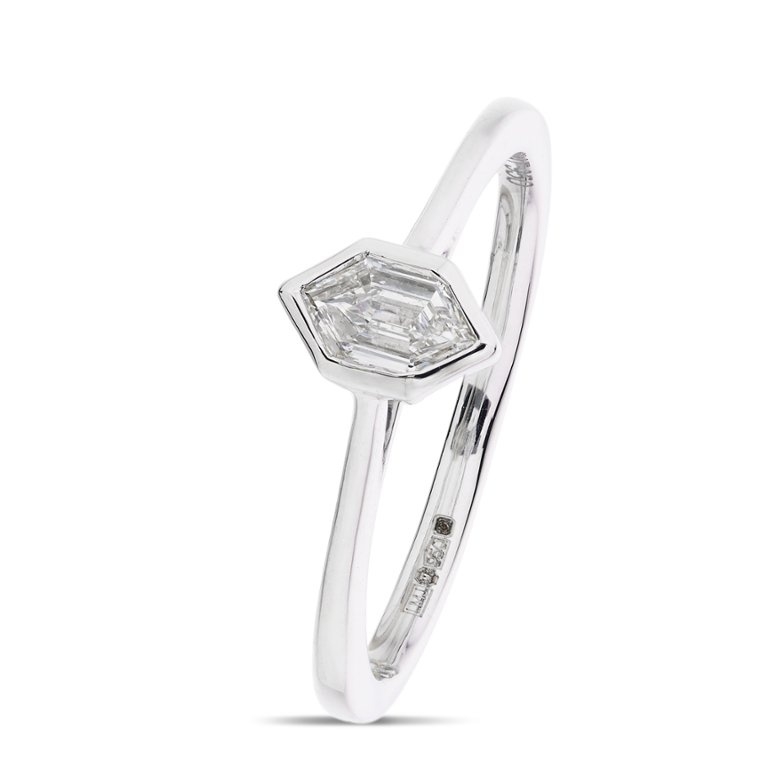 A brand new, unused certified natural diamond solitaire engagement ring set with one fancy-cut diamond in the centre, set in platinum.