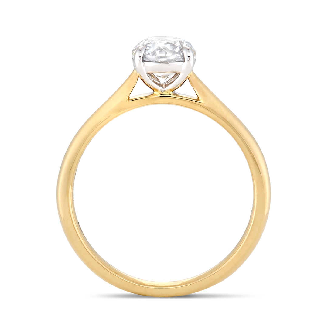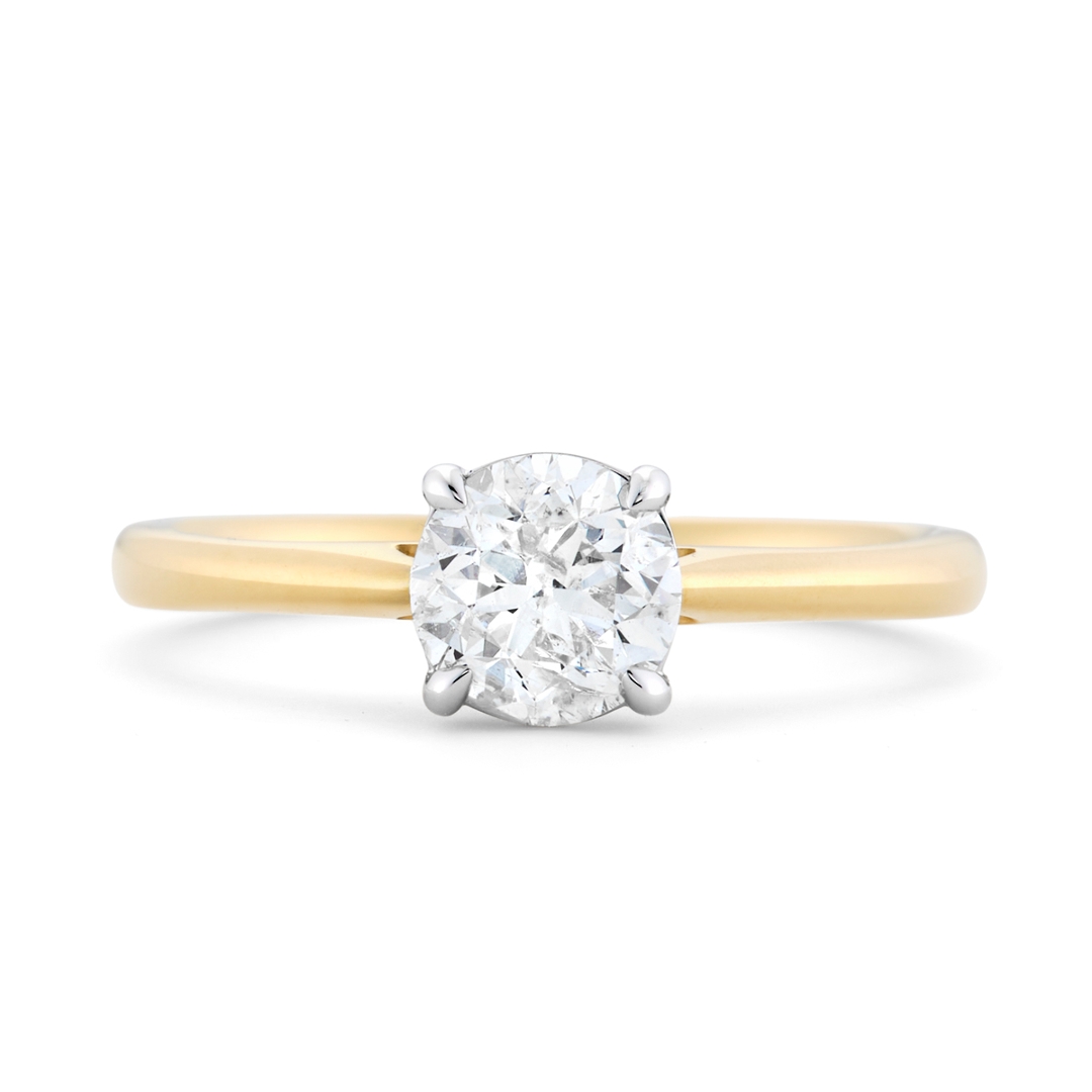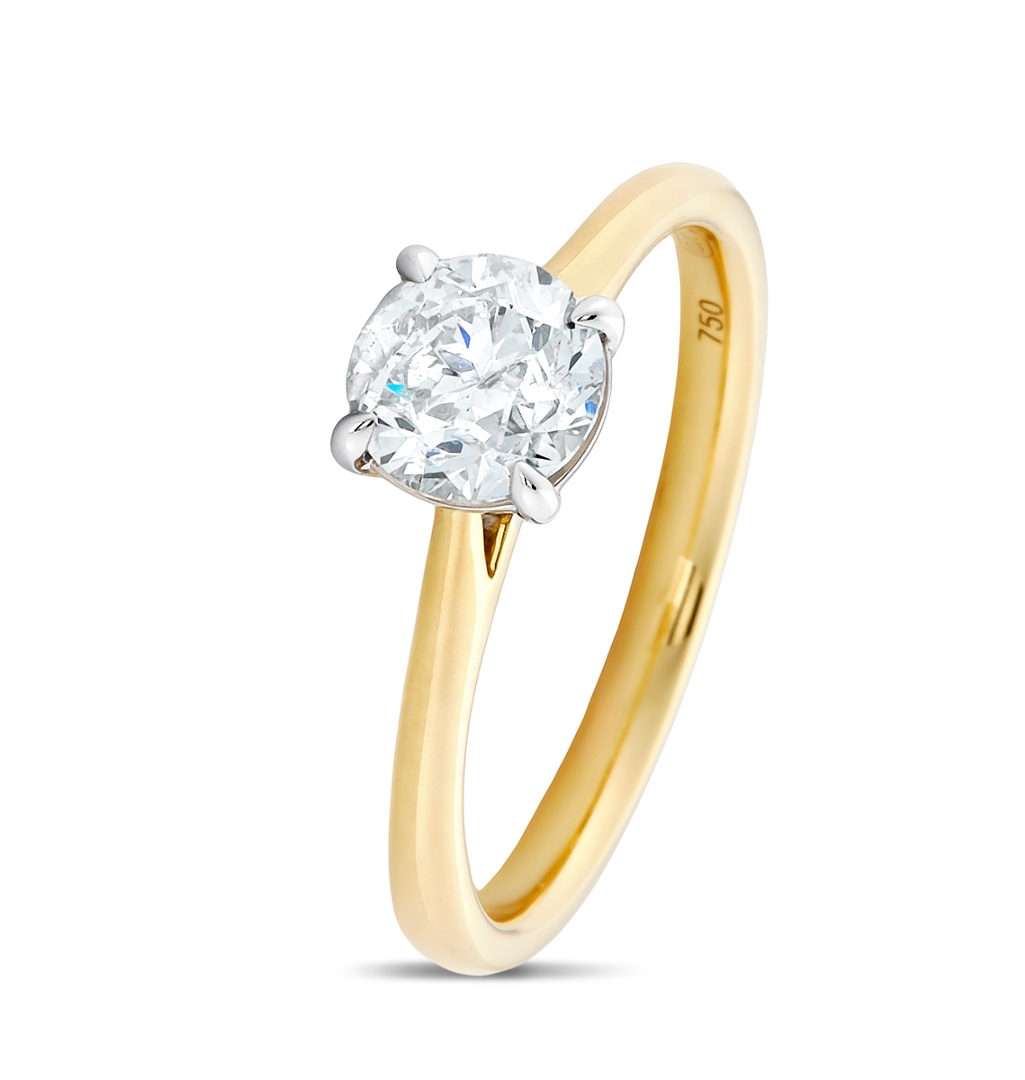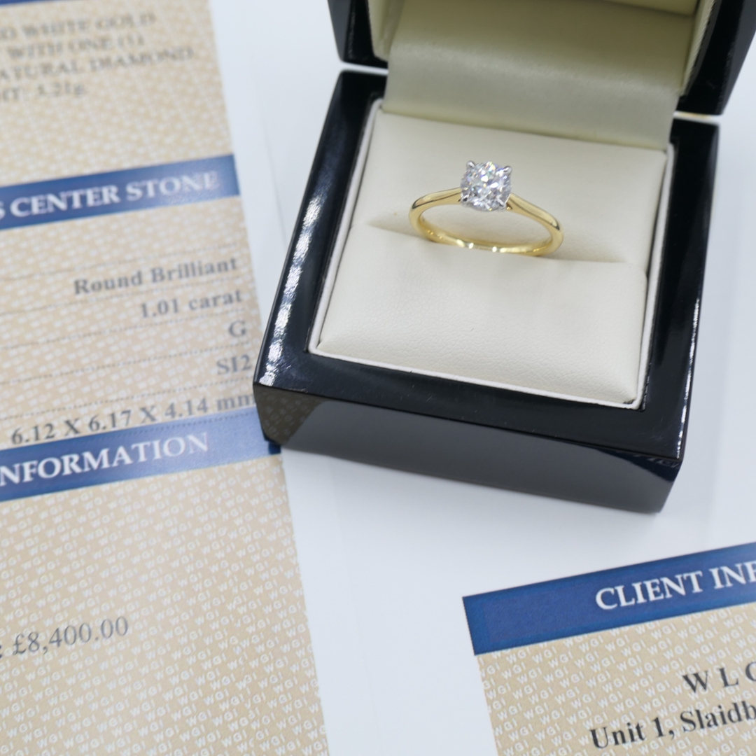 A brand-new, unused certified 18ct yellow and white gold solitaire engagement ring, crafted to highlight the timeless elegance of a natural diamond. At the centre is a brilliant cut diamond weighing 1.01 carats, graded SI2 clarity and G colour, offering a bright sparkle and classic character. The combination of white gold around the setting enhances the diamond’s luminosity, while the yellow gold band adds richness and warmth, creating a design that is both graceful and versatile, and enduring.