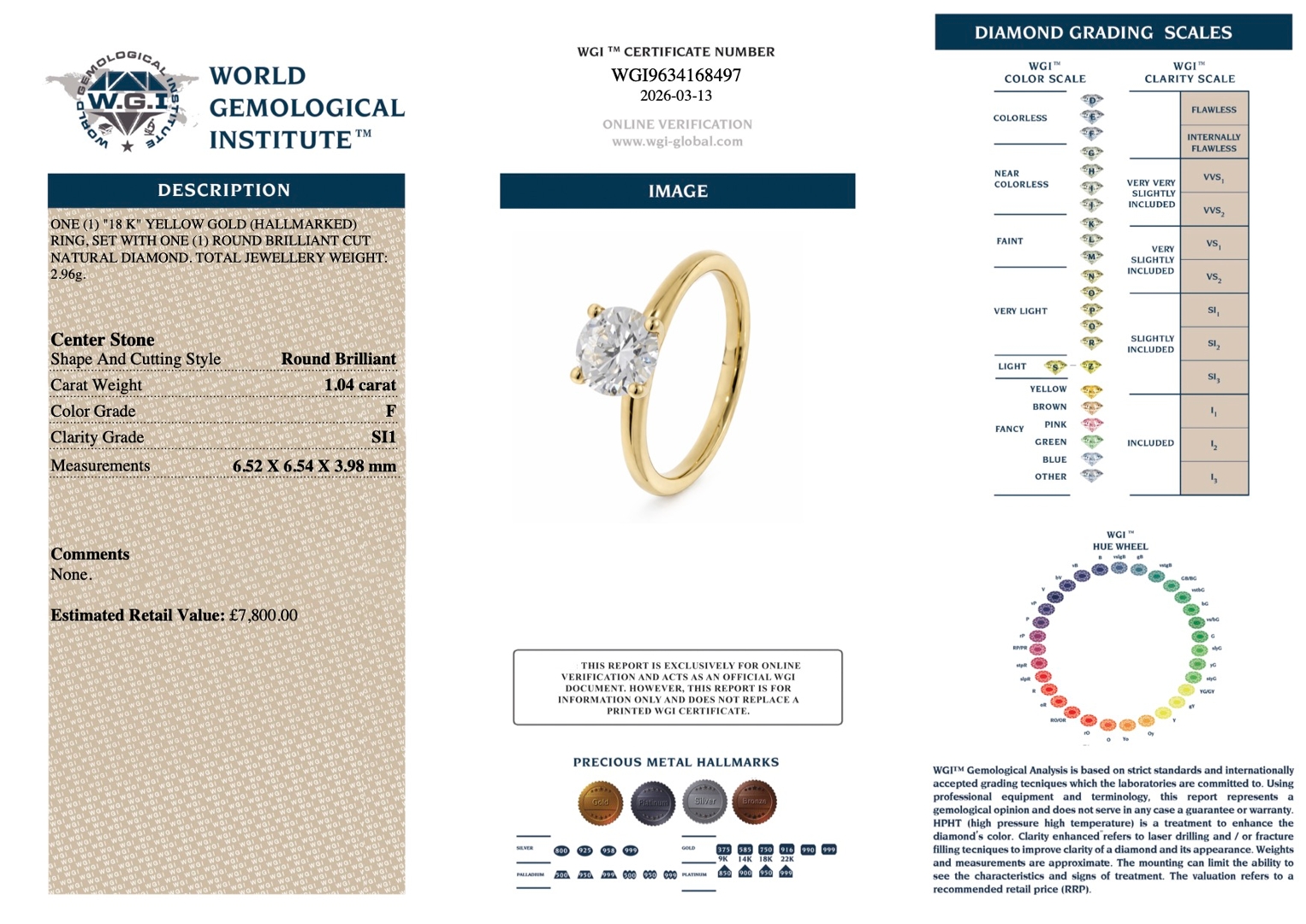 The diamond weighs an impressive 1.04ct, with a clarity grade of SI1 and a refined F colour, placing it firmly within the desirable near-colourless category. The brilliant cut is specifically engineered to maximise light return, resulting in exceptional sparkle and fire. Natural diamonds of this size and quality are increasingly sought after, with finite supply contributing to their continued appreciation and desirability within the global jewellery market.