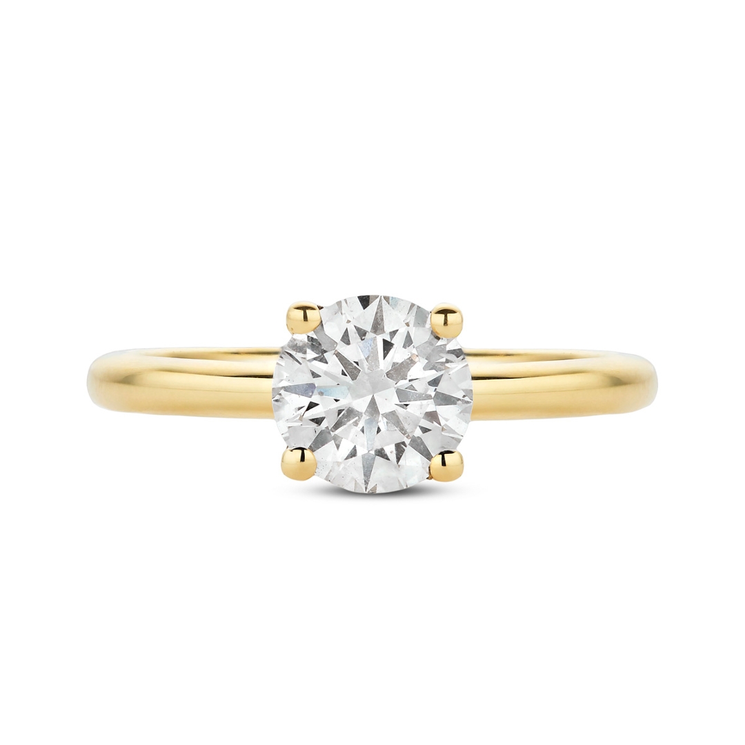A brand new, unused, certified natural diamond solitaire engagement ring, with one brilliant cut diamond at the centre, set in 18ct yellow gold.