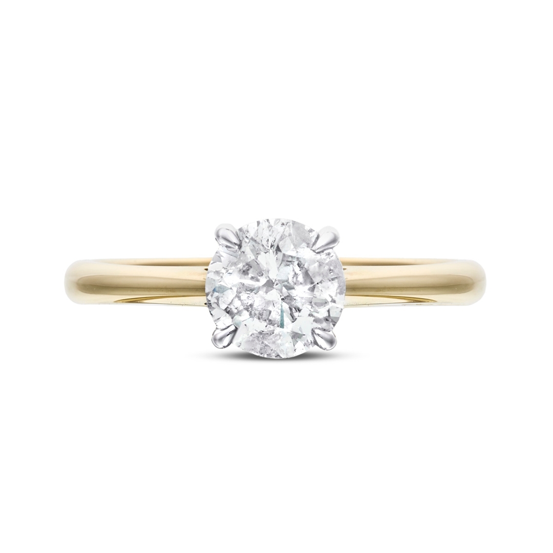 A brand-new, unused certified natural diamond solitaire engagement ring, set with a striking 1.21 carat brilliant cut diamond at its centre, mounted in an elegant combination of 18ct yellow and white gold. The contrasting two-tone setting enhances the diamond's presence, allowing the I colour stone to appear bright and lively, while the I1 clarity adds natural character to a beautifully proportioned cut. With a total weight of 3.31 grams, the ring feels both refined and reassuringly substantial on the hand.