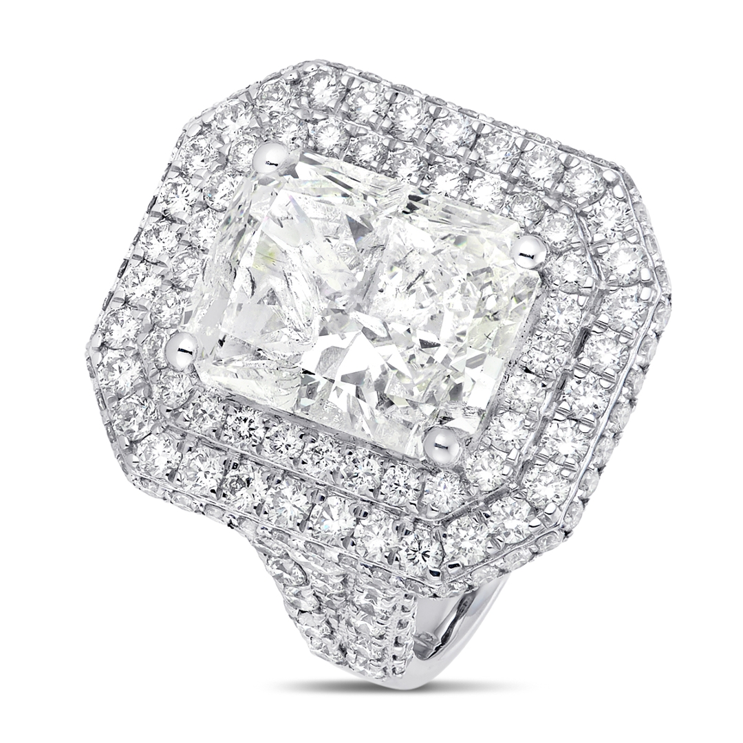 A brand-new, unused certified natural diamond solitaire engagement ring that radiates pure grandeur and timeless sophistication. At its centre, an extraordinary 8.78-carat radiant-cut natural diamond, graded K in colour and I1 in clarity, exudes remarkable presence and brilliance. Its impressive size and captivating fire make it a true statement of luxury, while its natural origin ensures rarity and authenticity that only earth-formed diamonds possess. Surrounding this magnificent centrepiece is a double halo of brilliant-cut diamonds, with additional clusters adorning the shoulders, totalling 4.45 carats of F–G colour and SI1–SI2 clarity. Together, they create an extraordinary display of light and depth that enhances the central diamond’s luminous allure.