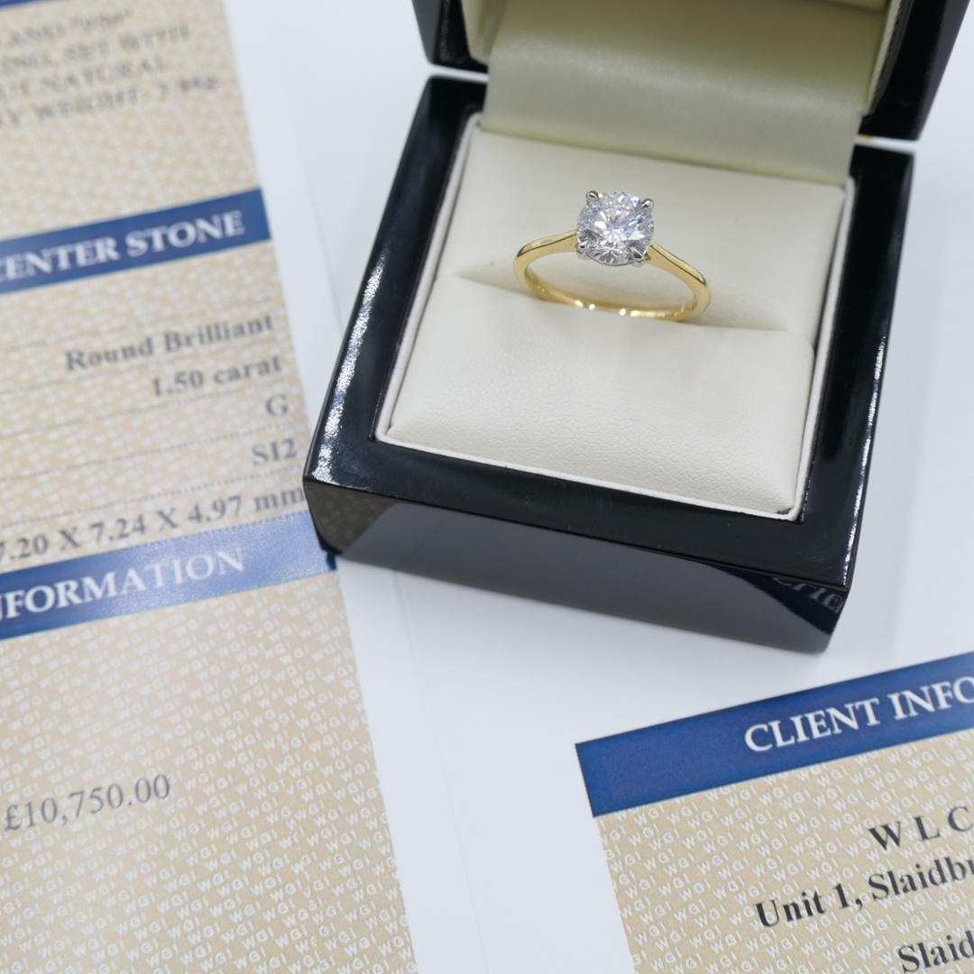 A brand-new, unused, certified platinum and 18ct yellow gold natural diamond solitaire engagement ring that combines classic elegance with heartfelt meaning. At the centre sits a 1.50ct brilliant cut diamond, admired for its generous size and captivating sparkle. With a clarity grade of SI2 and a colour grade of G, the diamond delivers an impressive balance of brilliance and warmth, its natural origin adding authenticity and rarity that enhance its timeless appeal.