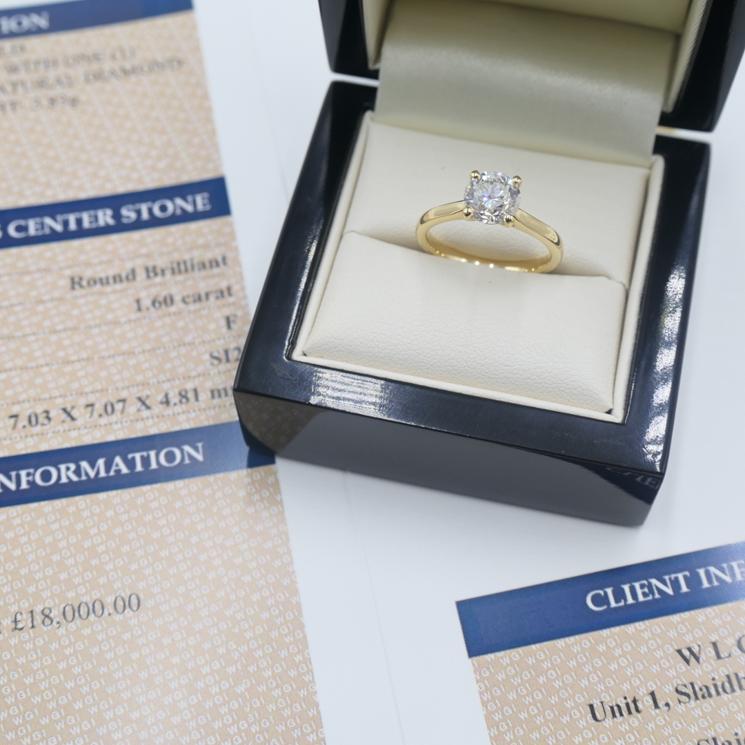 A brand-new, unused, certified natural diamond solitaire engagement ring, this magnificent piece embodies classic elegance and timeless allure. At its heart rests a stunning 1.60-carat brilliant-cut natural diamond, graded F in colour and SI2 in clarity, radiating remarkable fire and brilliance. The diamond’s pure white hue and lively sparkle exemplify the natural beauty and prestige that make genuine diamonds so coveted. Expertly cut to maximise light performance, it captures and reflects every glimmer, creating a captivating display of brilliance that symbolises everlasting love and devotion.