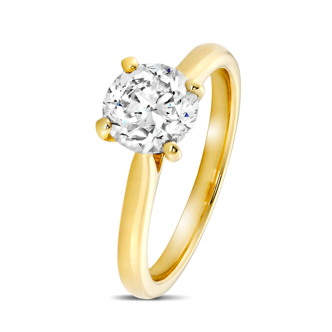 A brand-new, unused, certified natural diamond solitaire engagement ring, set with one brilliant-cut diamond at the centre, set in 18ct yellow gold.
