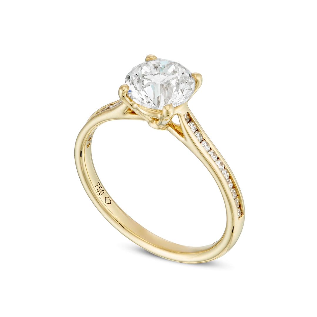 The warm tone of the 18ct yellow gold setting offers a timeless contrast against the crisp brilliance of the diamonds, creating a classic yet eye-catching aesthetic. Weighing 2.77g, the ring is both lightweight and elegant, designed for comfortable daily wear while maintaining a luxurious presence. Its enduring design ensures it remains a highly desirable style within the engagement ring market.