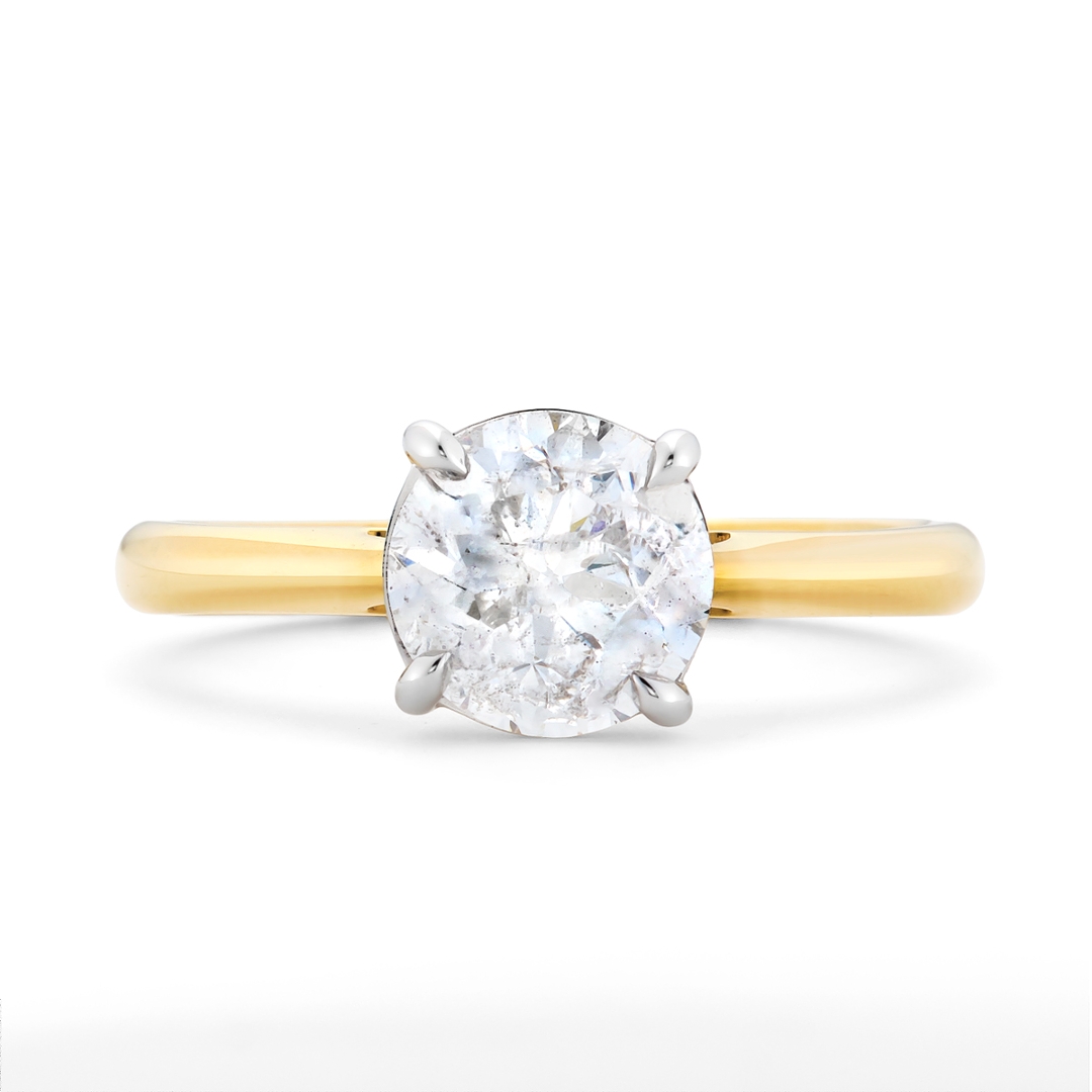 A brand-new, unused certified 18ct yellow and white gold solitaire engagement ring, created to celebrate the enduring beauty of a natural diamond. At its centre lies a brilliant-cut stone weighing 1.72 carats, graded SI2 clarity and H colour, which displays a lively sparkle and impressive presence. The white gold setting enhances the diamond’s brightness, while the yellow gold band adds warmth and character, resulting in a design that is both elegant and timeless. This harmonious combination of metals ensures the diamond remains the focal point while offering a distinctive style.
