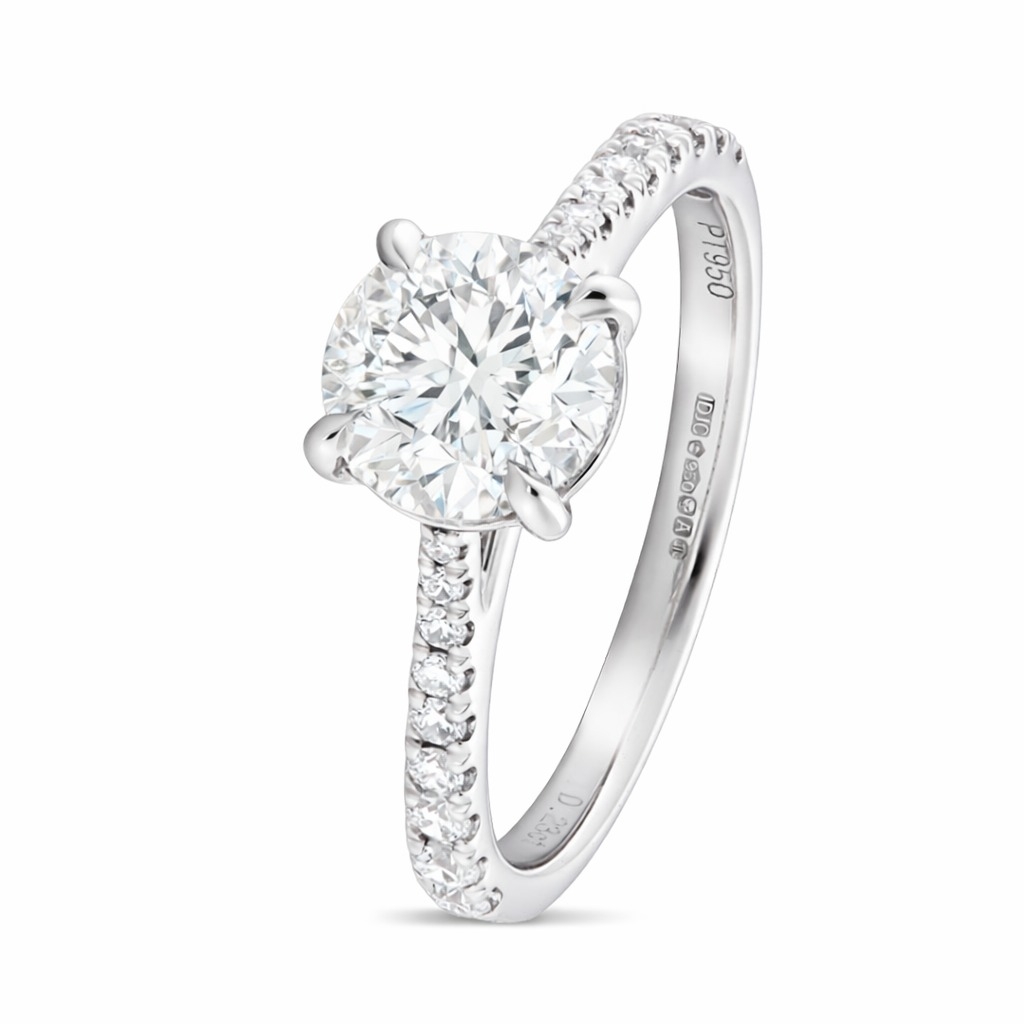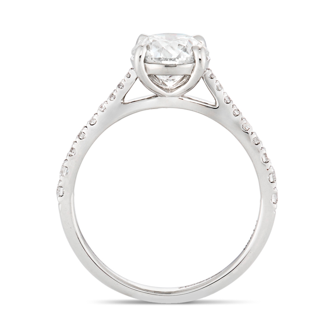 The shoulders of the ring are delicately adorned with an additional cluster of brilliant-cut diamonds, weighing 0.23ct in total. With clarity ranging from VS2 to SI1 and colour grades of F-G, these accent stones offer a crisp brilliance that perfectly complements the centre diamond. The platinum setting adds further prestige, known for its durability and strength, ensuring the stones are securely held while complementing their radiance. Its refined design makes the ring comfortable to wear while remaining striking.