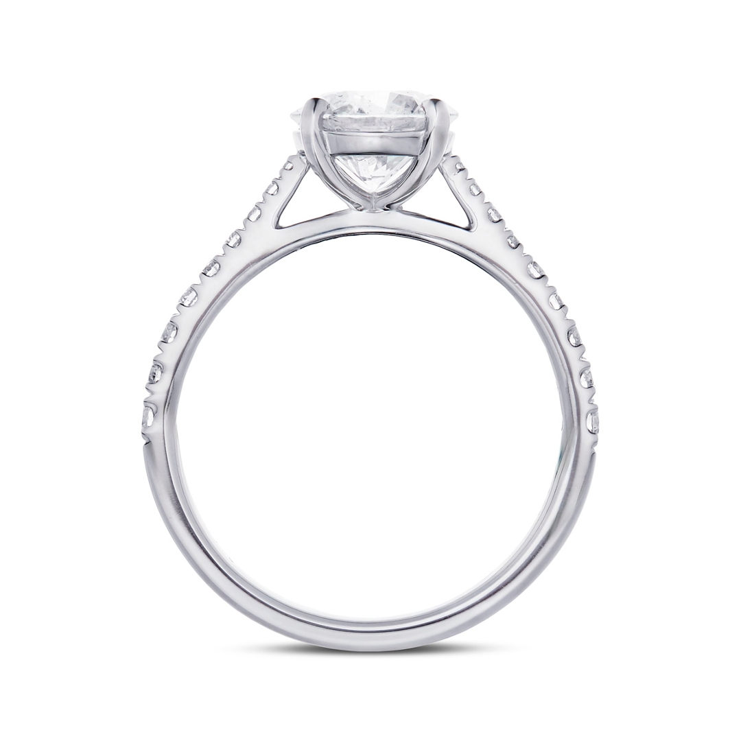 The shoulders are adorned with a refined cluster of brilliant-cut diamonds totalling 0.23ct, with clarity grades ranging from VS2 to SI1 and colour grades of G–H. These carefully set accent stones enhance the ring's overall radiance, adding subtle complexity and sparkle while maintaining a balanced, timeless design that complements the prominence of the centre diamond.