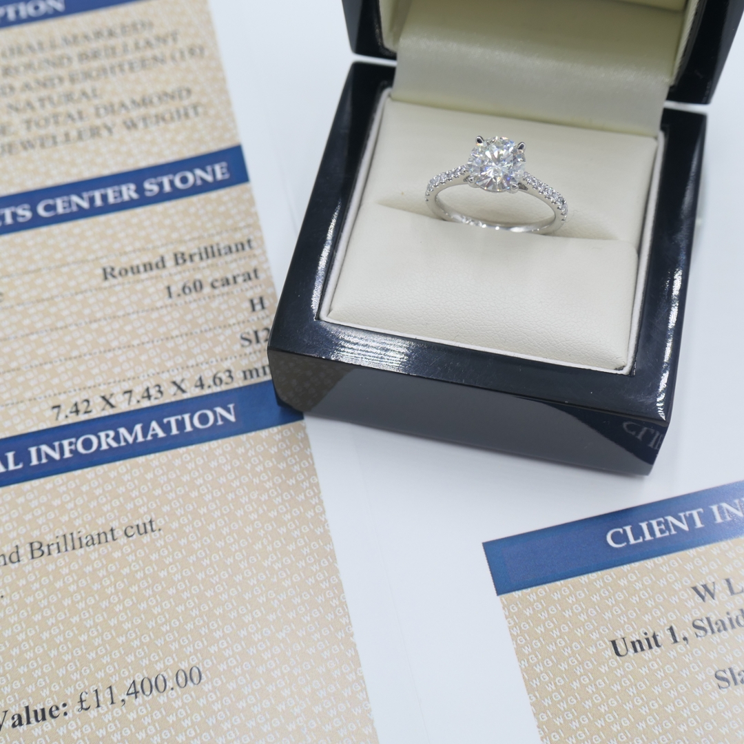 A brand-new, unused certified platinum solitaire engagement ring, designed with elegance and balance to showcase the beauty of natural diamonds. At its centre sits a brilliant-cut diamond weighing 1.60 carats, graded SI2 clarity and H colour, which offers a lively sparkle with a commanding presence. Enhancing the central stone, the shoulders are set with a cluster of brilliant cut diamonds totalling 0.25 carats, graded SI1 clarity and G–H colour. This thoughtful detail adds extra fire and brilliance, ensuring the ring captures the light from every angle while maintaining a timeless and refined style.