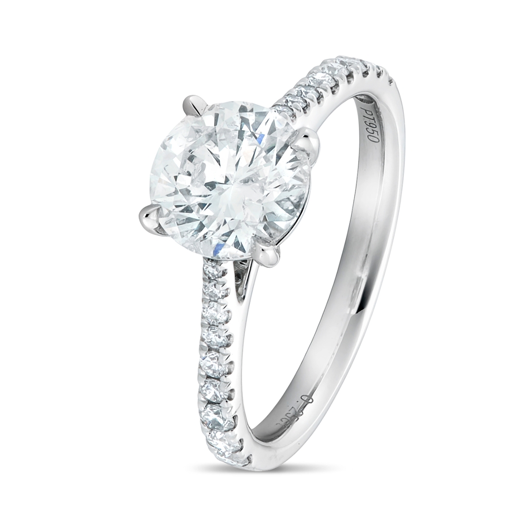 A brand-new, unused, certified platinum natural diamond solitaire engagement ring set with one brilliant-cut diamond at the centre & a cluster of brilliant-cut diamonds to the shoulders.