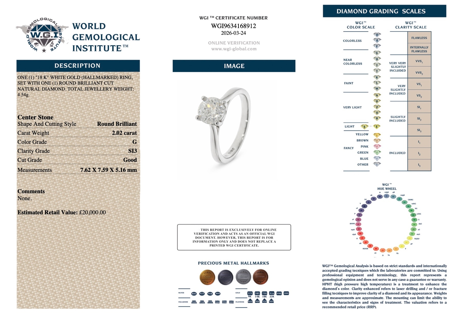A brand-new, unused certified natural diamond solitaire engagement ring, showcasing a commanding 2.02ct brilliant-cut diamond set in 18ct white gold. The centre stone presents a bright G colour, delivering a crisp and lively appearance, while its SI3 clarity offers an appealing balance of presence and accessibility. Expertly secured in a classic claw setting, the diamond is elevated to maximise light reflection, allowing its natural brilliance to perform effortlessly in all lighting conditions.