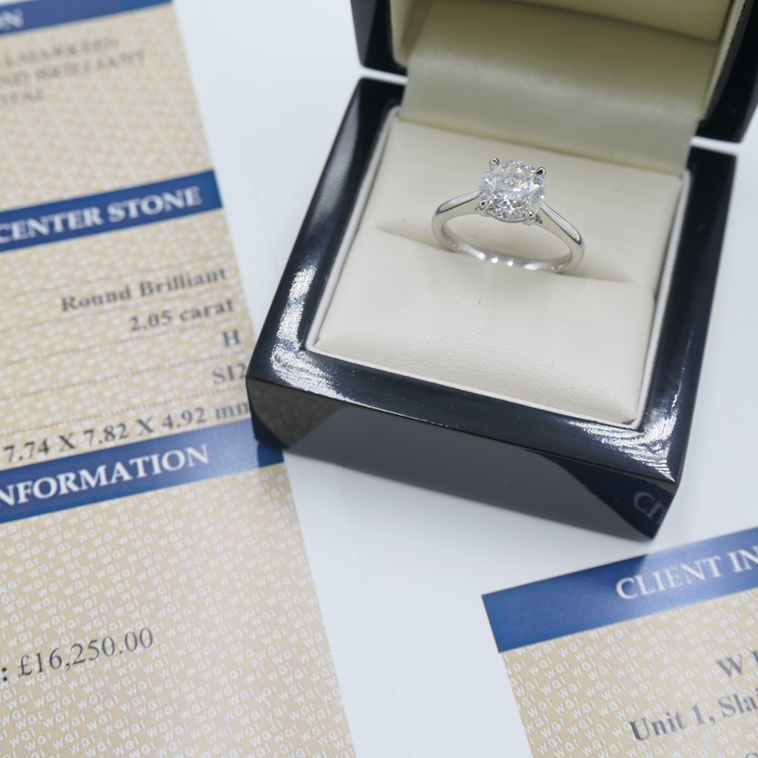 A brand-new, unused certified natural diamond solitaire engagement ring that captures timeless beauty and sophistication. At its heart lies a magnificent 2.05-carat brilliant-cut natural diamond, perfectly showcasing the fire and brilliance that make this cut so admired. Graded H in colour and SI2 in clarity, the diamond displays an exceptional sparkle with a warm radiance, exuding elegance from every angle. Its flawless symmetry and outstanding proportions allow the light to dance effortlessly across the surface, creating a mesmerising display of brilliance and depth.