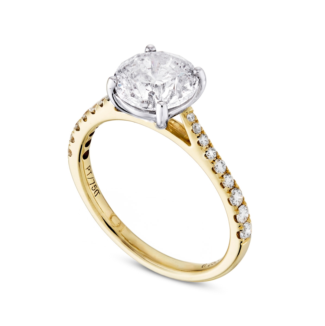 The shoulders are set with a cluster of brilliant-cut diamonds totalling 0.25ct, with SI1 clarity and G–H colour grades. These accent stones introduce additional sparkle and light dispersion, enhancing the centre diamond without detracting from its prominence. The contrast between platinum and yellow gold adds a classic yet distinctive character, appealing to those seeking both tradition and individuality in their jewellery.