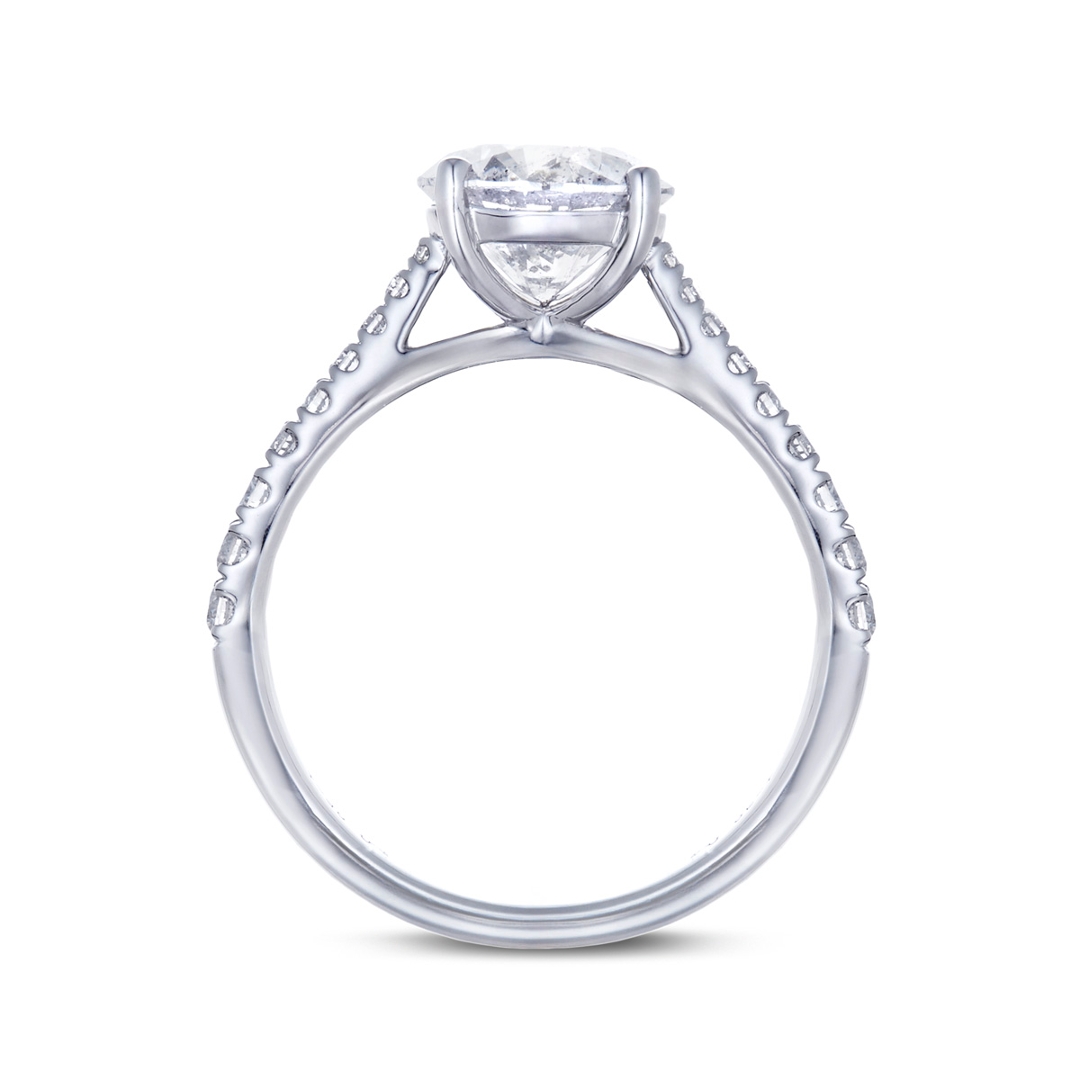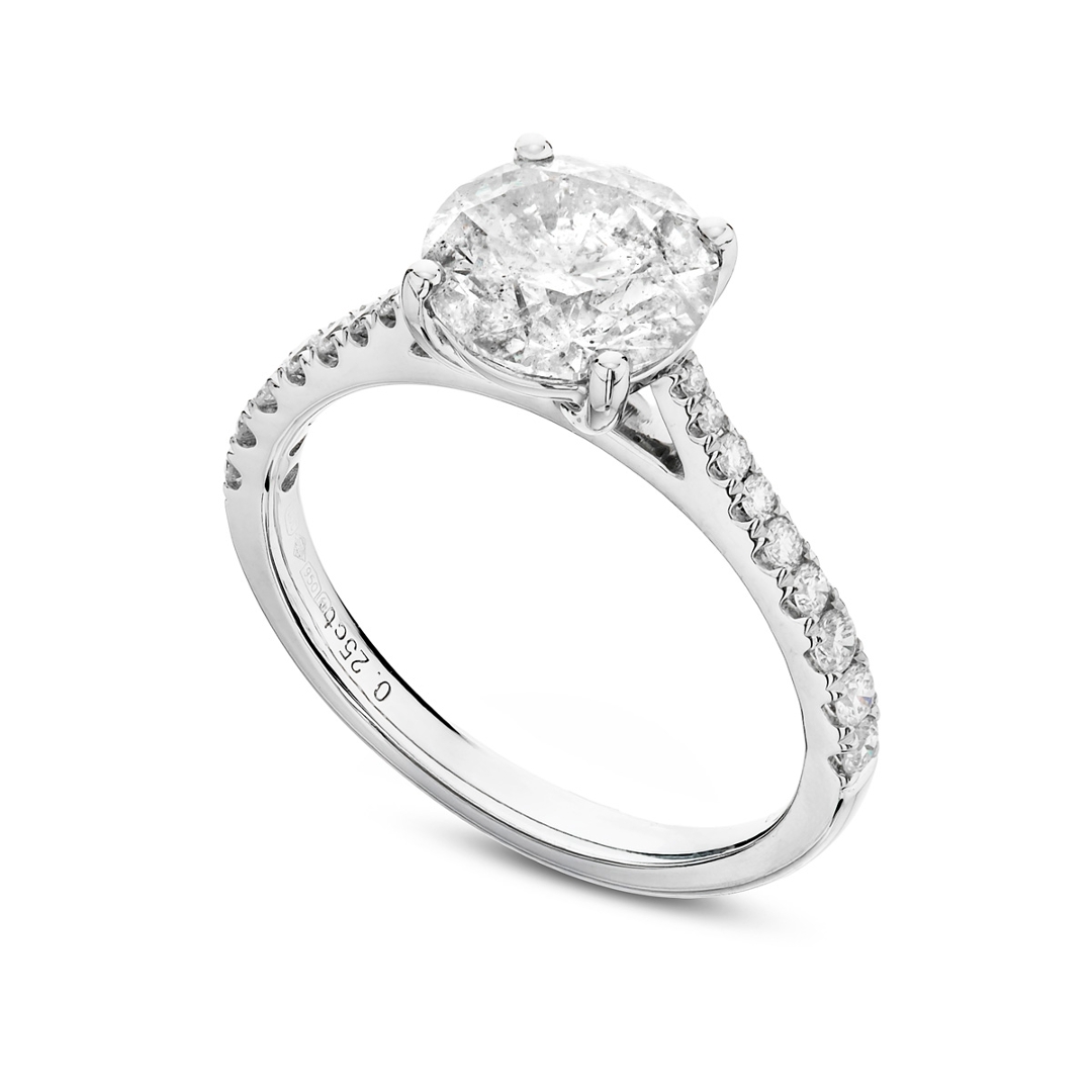 The shoulders are set with a cluster of brilliant-cut diamonds totalling 0.25ct, with SI1 clarity and G–H colour grades. These accent stones add a refined layer of sparkle, enhancing the overall light performance and creating a seamless transition of brilliance along the band while keeping the focus firmly on the centre diamond.