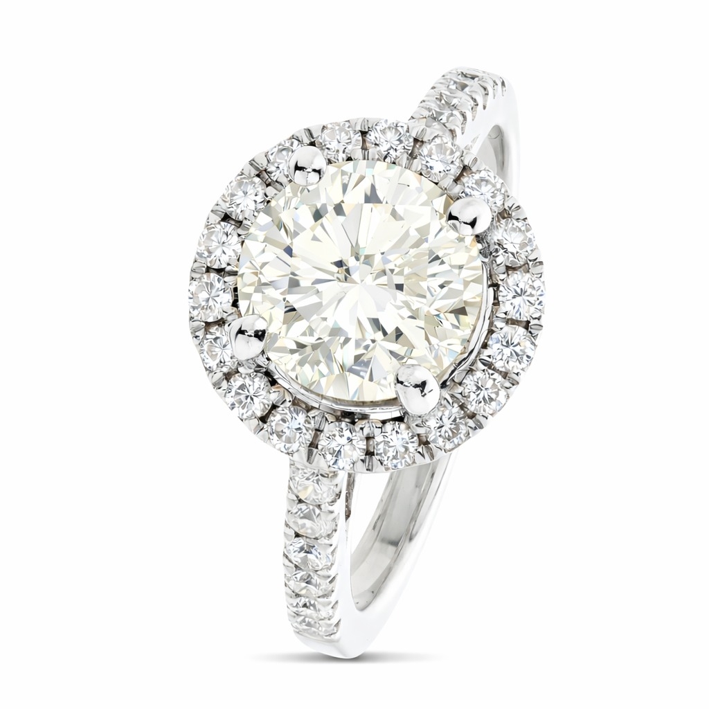 The centrepiece diamond, with a clarity grade of SI2 and a colour grade of K, exudes a unique warmth and character, making it a standout feature of this exquisite ring. Surrounding it, the shimmering halo of diamonds, coupled with the brilliance of the shoulder diamonds, each with a clarity range of VS2 to SI1 and a colour range of H to I, adds depth and dimension to its timeless beauty. Crafted from 18ct white gold and weighing 4.69 grams, this ring epitomises luxury and refinement, promising durability and enduring elegance. At £30,000.00, it is a wise investment, reflecting the exceptional quality and craftsmanship embodied in its design.