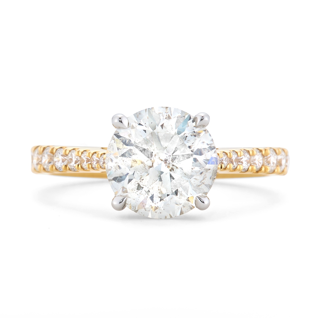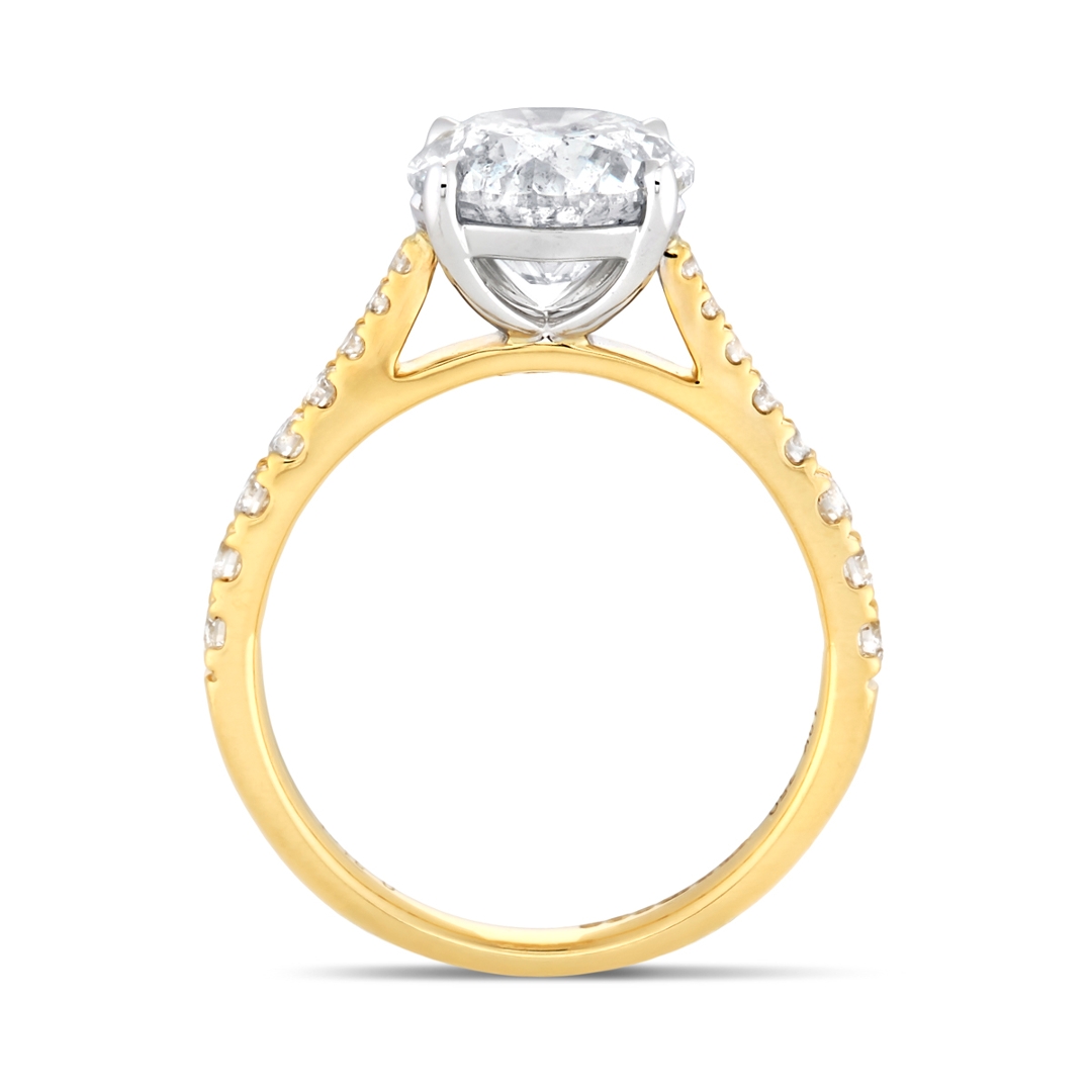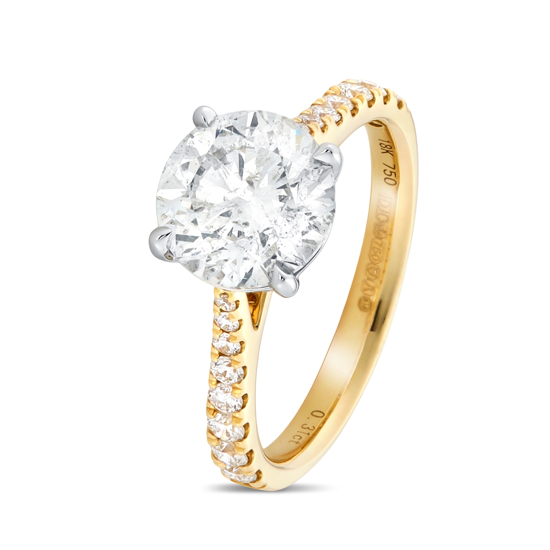 Set within an exquisite 18ct yellow and white gold mount, the contrasting tones of warm gold and cool lustre perfectly highlight the stones' brilliance. The shoulders are adorned with a refined cluster of smaller brilliant-cut diamonds totalling 0.31 carats, of F–G colour and SI1 clarity, amplifying the ring’s radiant allure. Together, they form a design that is both classic and captivating, weighing 3.86 grams and promising a lifetime of beauty.
