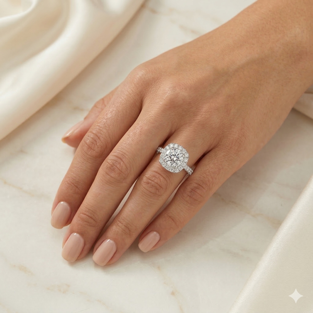 Encircling the centre diamond is a halo of brilliant-cut natural diamonds, extending seamlessly along the shoulders and adding a further 1.03ct in total. These accent stones, graded G–H colour and SI1–SI2 clarity, are carefully matched to enhance the centre stone’s presence, amplifying sparkle and creating exceptional finger coverage. The platinum setting provides a cool-toned backdrop that enhances the diamonds' brightness while offering strength and durability. The total ring weight is 7.56g, giving a reassuring and substantial feel.