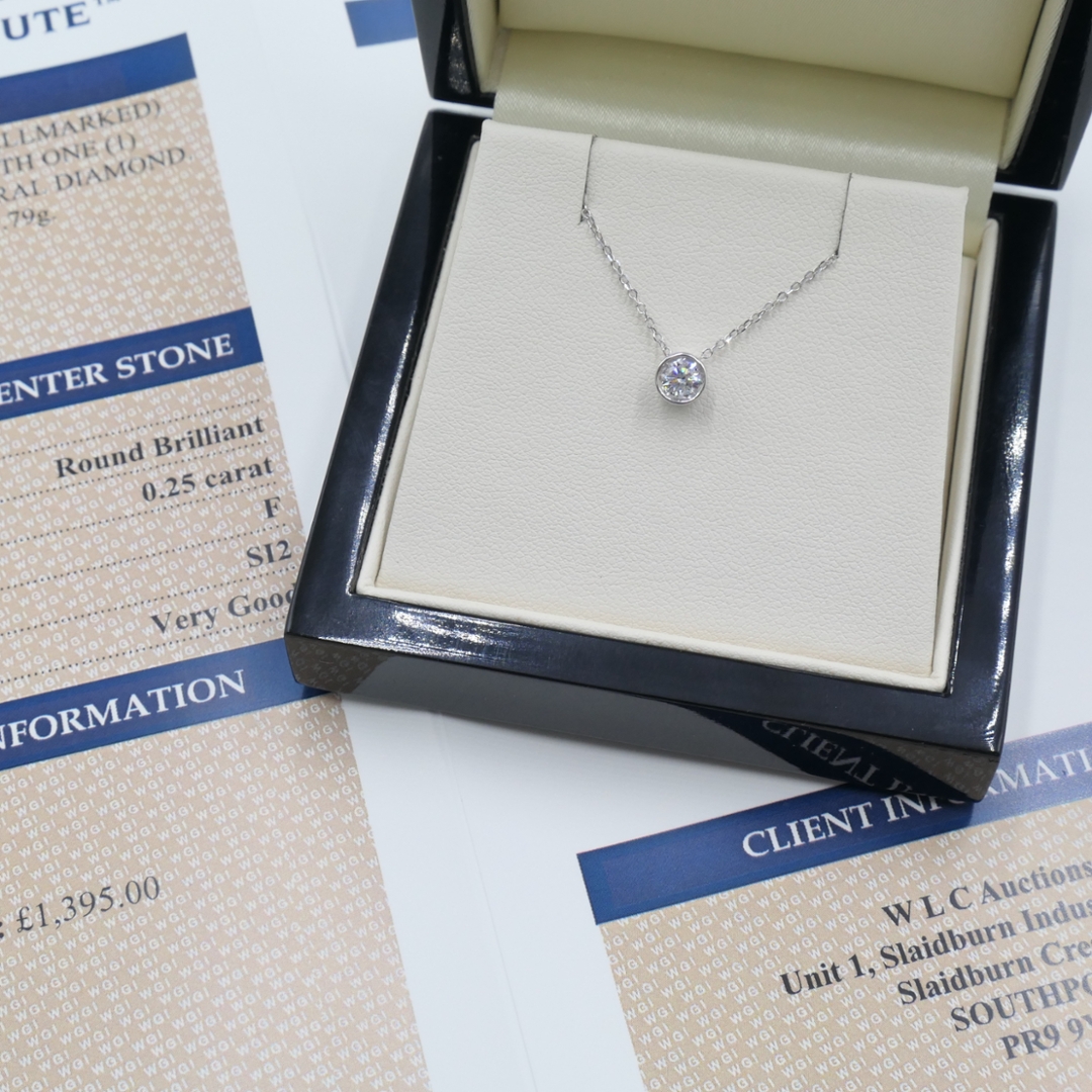 A brand-new, unused, certified 18ct white gold natural diamond solitaire pendant, set with one brilliant cut diamond.