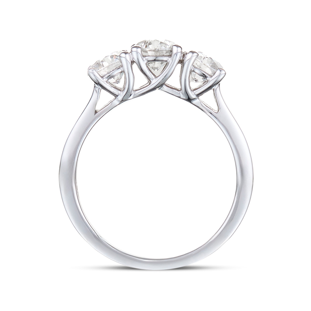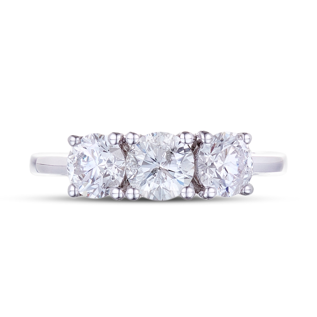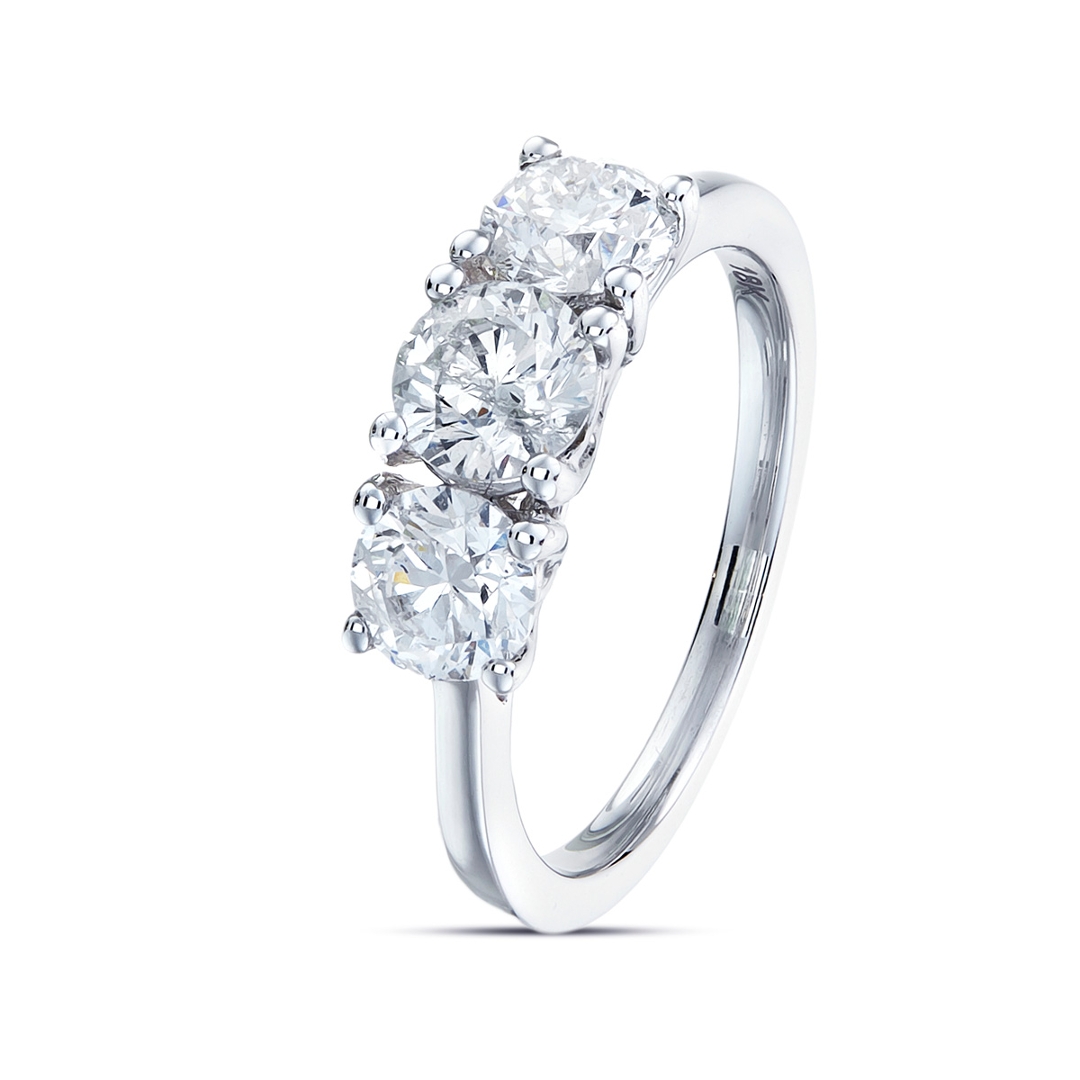 Crafted from 18ct white gold, the metal setting provides a sleek and modern backdrop for the dazzling diamonds. Weighing 3.40 grams. The three-stone design symbolises a relationship's past, present, and future, making this ring a meaningful and romantic choice.