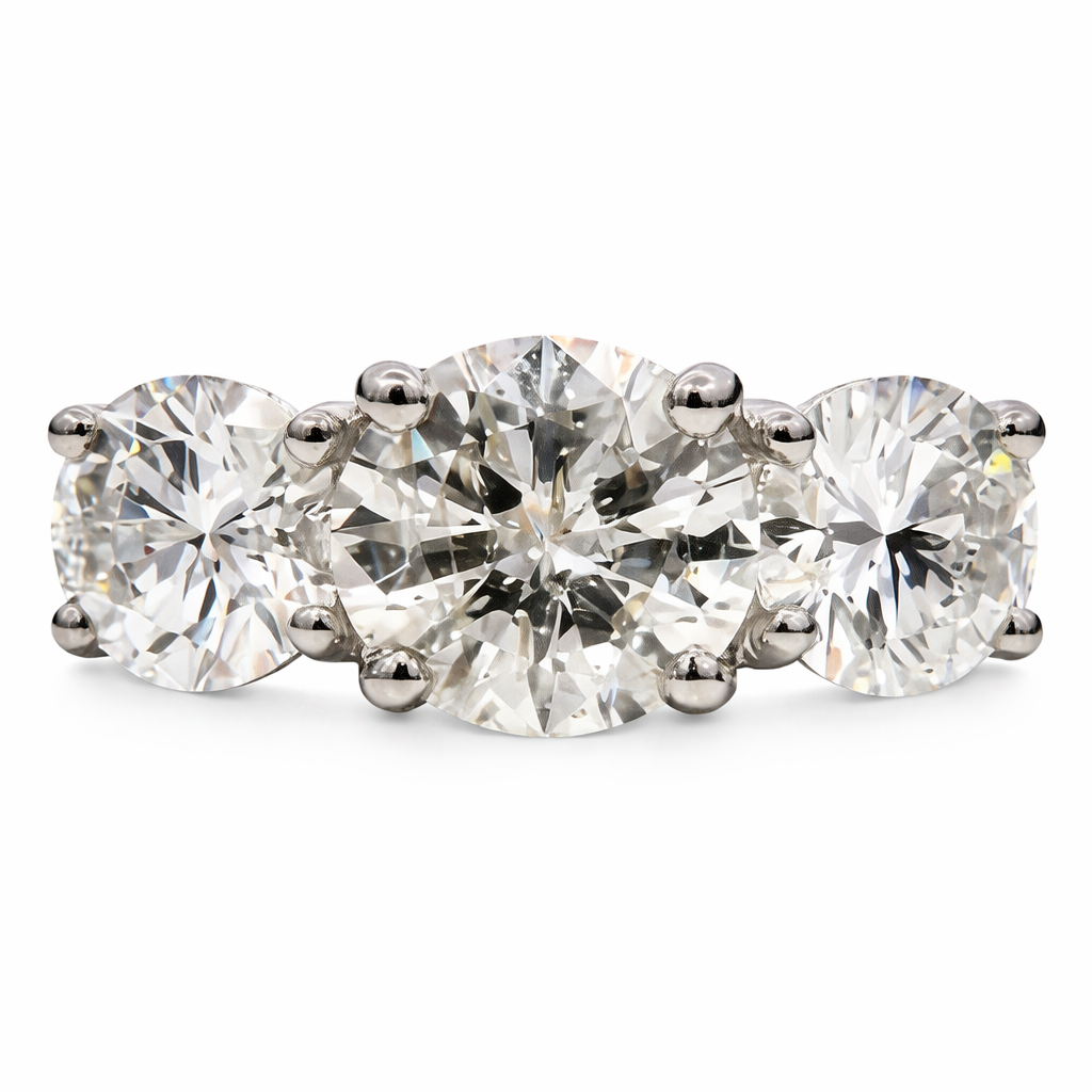 A brand-new, unused certified natural diamond three-stone ring, set with three exceptional brilliant-cut diamonds totalling an impressive 3.28ct, elegantly mounted in platinum. The classic three-stone design offers a powerful and balanced presence across the finger, symbolising past, present and future, while allowing each diamond to stand out with equal prominence and refined proportion within a timeless setting.