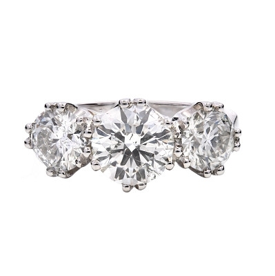 The carefully matched diamonds display bright near-colourless tones and strong scintillation, allowing the classic trilogy design to symbolise past, present and future while maintaining a bold, contemporary profile. Crafted in platinum and weighing a solid 7.61g, the setting provides both durability and a refined framework that enhances the natural fire of the stones without distraction.