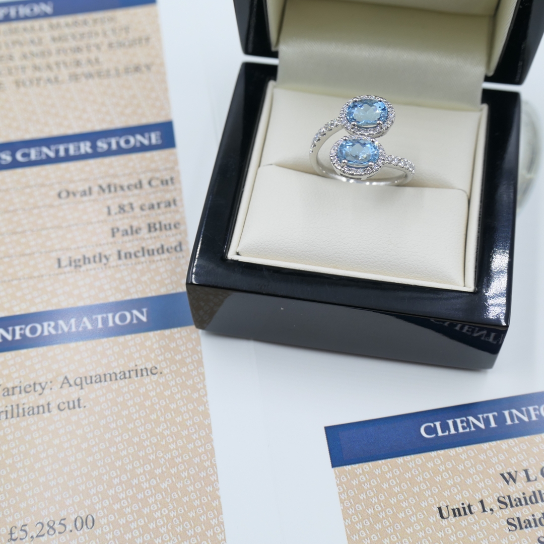 A brand-new, unused certified natural diamond and aquamarine toi et moi ring that radiates elegance, sophistication, and timeless charm. At its centre are two oval mixed-cut aquamarine gemstones, together weighing 1.83 carats, displaying a serene pale-blue hue that evokes clarity and calm. Surrounding the twin aquamarines is a halo of brilliant-cut natural diamonds, which continue delicately along the shoulders to create a graceful display of sparkle and refinement. With a total diamond weight of 0.39 carats, graded G–H in colour and SI1–SI2 in clarity, the diamonds provide exceptional brilliance, perfectly enhancing the tranquil glow of the aquamarines.