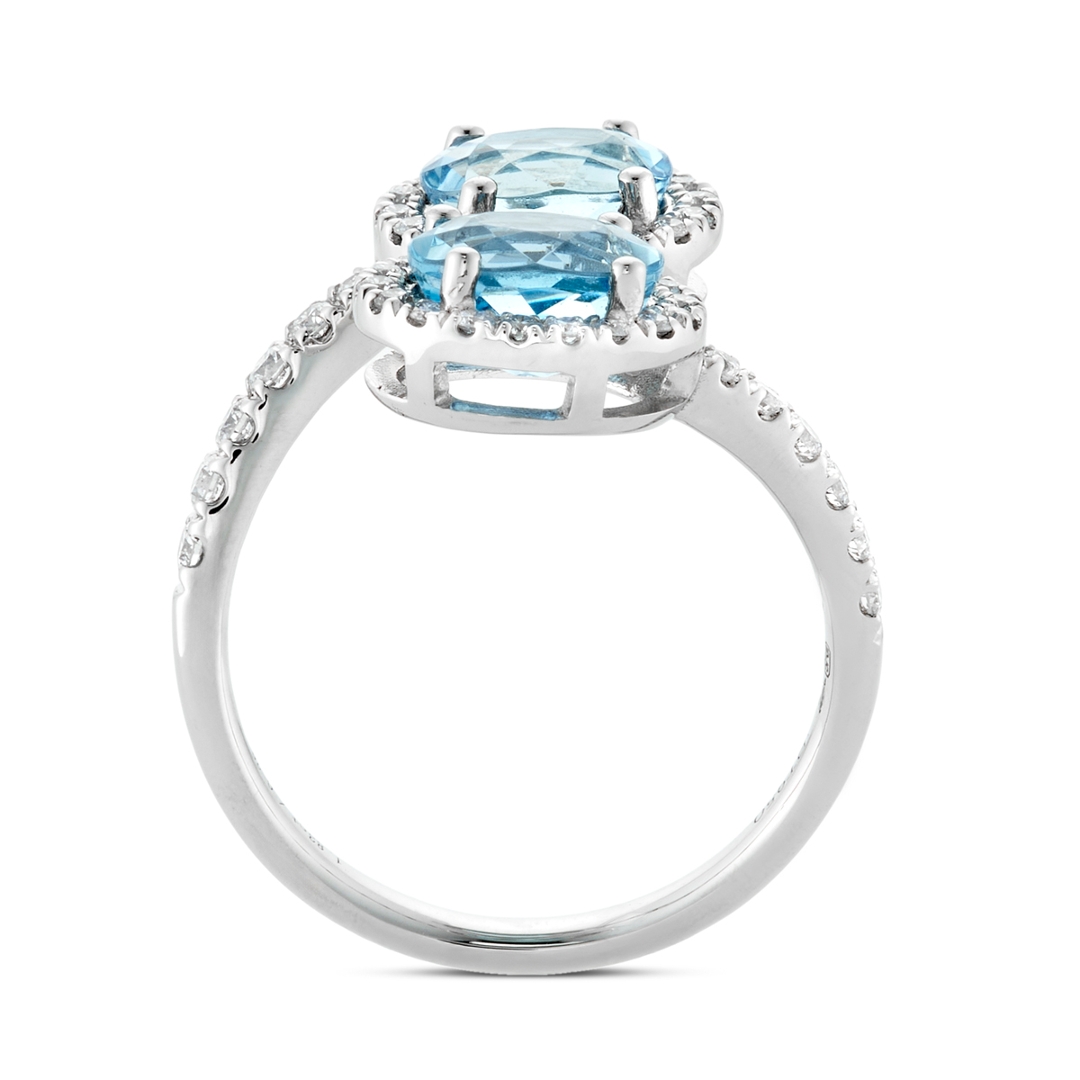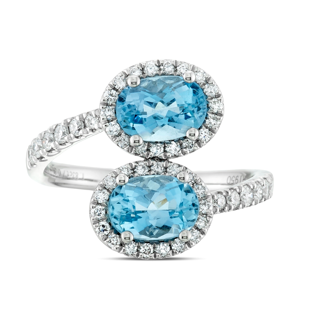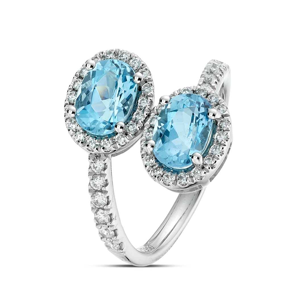 - > Natural Double Aquamarine 1.83ct & Diamond 0.39ct Oval Shaped Toi et Moi Ring