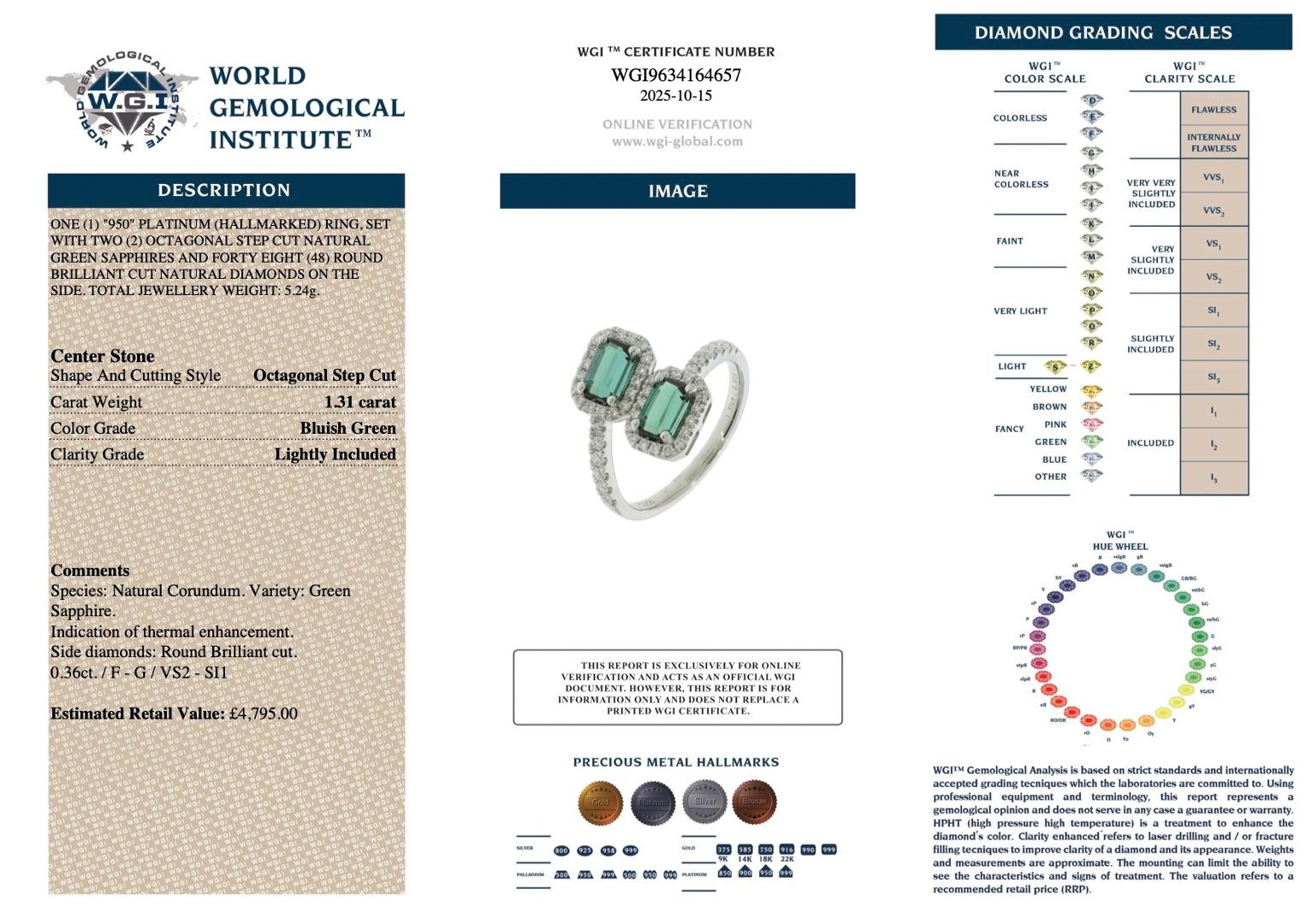 A brand-new, unused certified natural diamond and double green sapphire cluster ring that embodies refined elegance and contemporary luxury. At its centre are two octagonal step-cut green sapphires, totalling 1.31 carats, displaying a captivating bluish-green hue that shifts beautifully under the light. These vibrant gemstones are framed by a halo of brilliant-cut natural diamonds, which continue along the shoulders to create a radiant, flowing sparkle. The diamonds, weighing 0.36 carats in total and graded F–G in colour with VS2–SI1 clarity, provide exceptional brilliance and perfectly complement the sapphires’ rich tones.