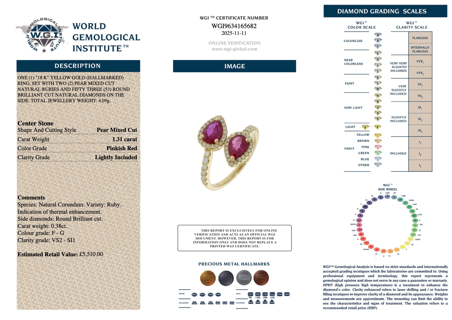 Crafted in 18ct yellow gold and weighing 4.09g, the ring benefits from the rich warmth of the gold, which enhances the rubies’ colour while providing strength and a luxurious finish. Natural diamonds also remain recognised for their investment potential, supported by stable global demand and their reputation for retaining value over time, offering reassurance for buyers seeking lasting worth. Fresh in condition and accompanied by a valuation of £5,510.00, this thoughtfully designed ring presents a meaningful and beautifully balanced piece for anyone looking to acquire jewellery crafted with enduring quality and vibrant character.