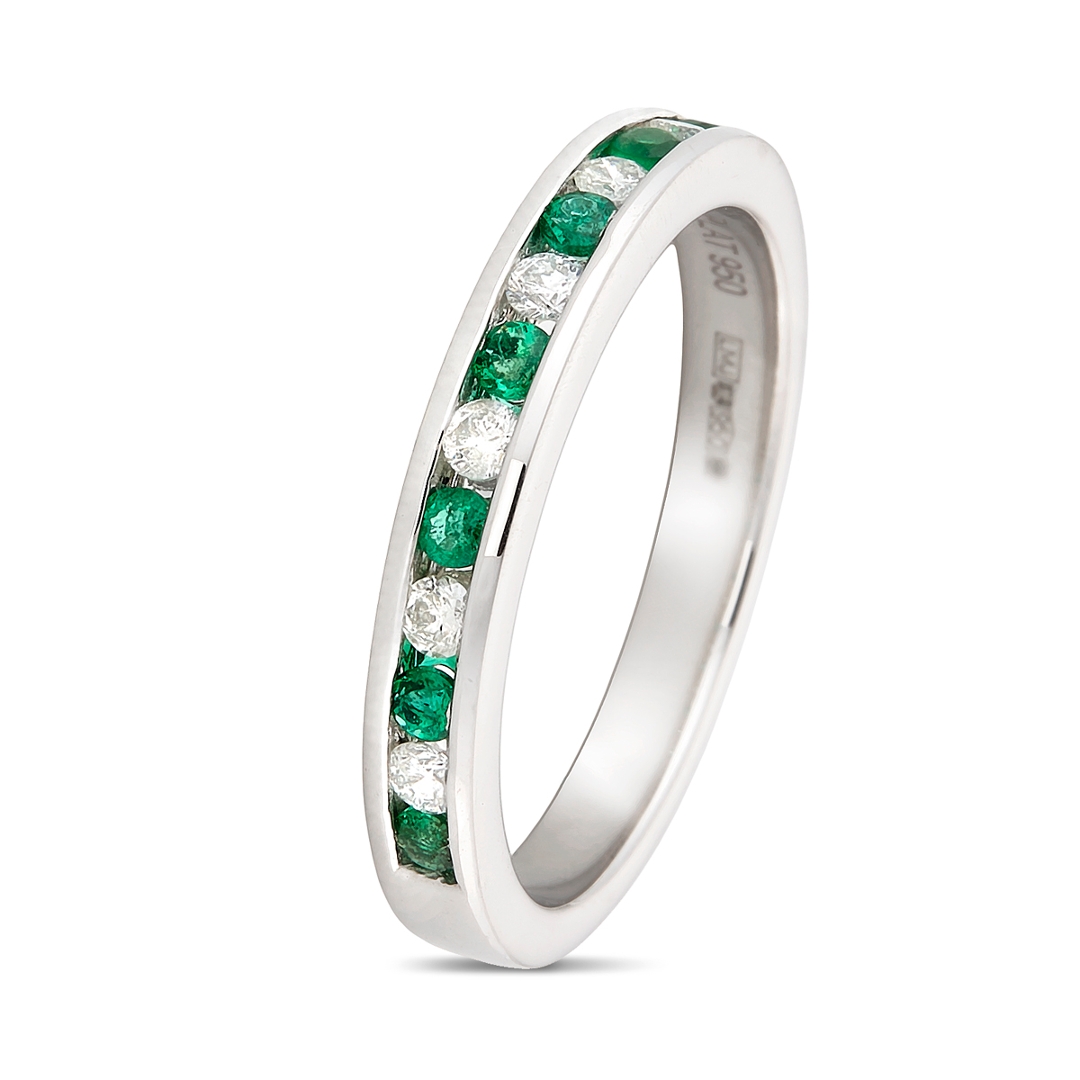 A brand-new, unused eternity ring crafted in platinum, this certified piece exudes refined beauty and enduring elegance. Set with seven round mixed-cut natural emeralds and six brilliant-cut natural diamonds, it captures both vivid colour and radiant sparkle in perfect harmony. The emeralds, weighing 0.22ct, display a rich green tone that enhances the cool sophistication of the platinum setting. At the same time, the diamonds, totalling 0.18ct, are graded G–H in colour with SI1–SI2 clarity, offering lively brilliance that enhances their natural charm.