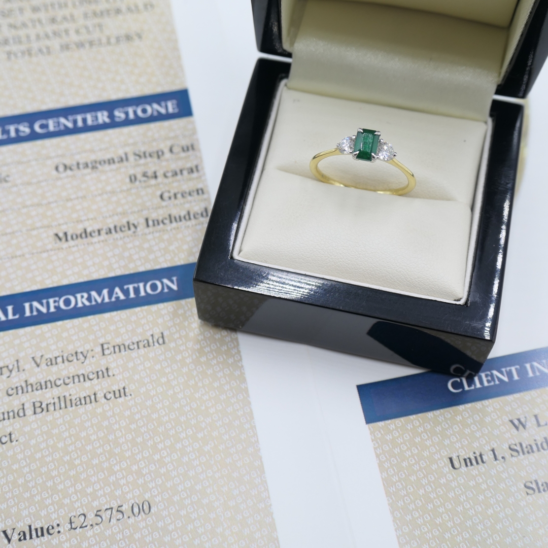 A brand-new, unused certified 18ct yellow and white gold three-stone cluster ring featuring a striking natural octagonal step-cut emerald gemstone weighing 0.54ct at its centre, beautifully complemented by two brilliant-cut natural diamonds totalling 0.34ct. These diamonds exhibit impressive SI1 clarity and attractive H-I colour, creating a captivating interplay of brilliance alongside the vivid green emerald. Expertly crafted in luxurious two-tone gold, this elegant setting enhances the inherent rarity and allure of genuine gemstones.
