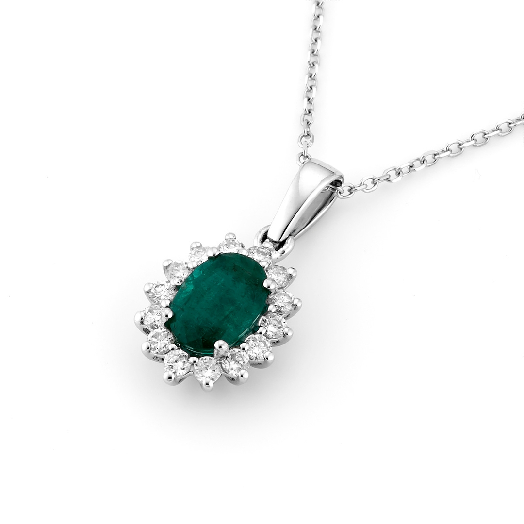 A brand-new, unused, certified natural diamond & emerald gemstone cluster pendant, with one oval mixed-cut emerald gemstone & a cluster of brilliant-cut diamonds, set in 18ct white gold.