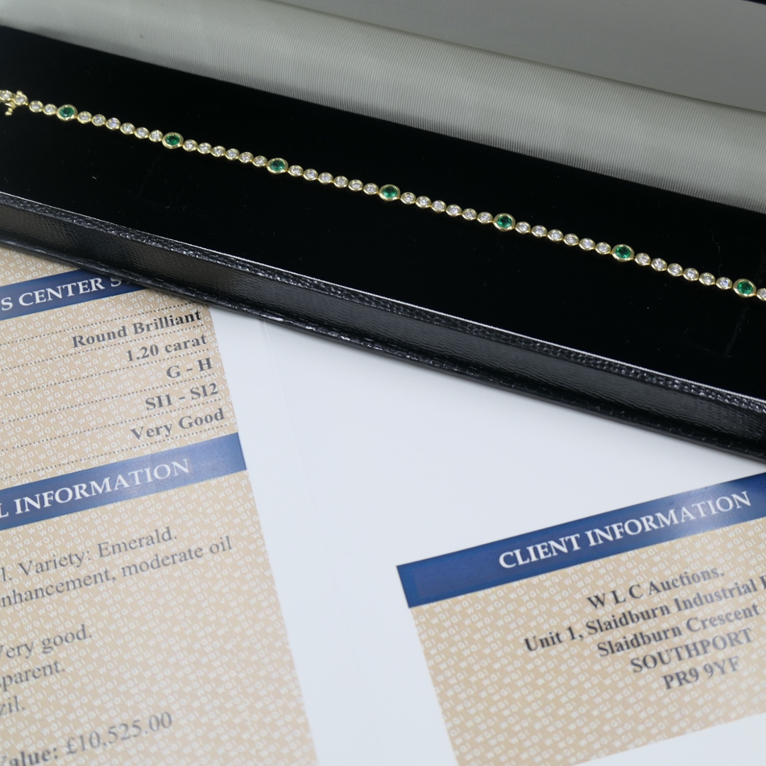 A brand-new, unused, certified natural diamond & emerald line bracelet, set with eight round cut emerald gemstones & a cluster of brilliant-cut diamonds, set in 18ct yellow gold.