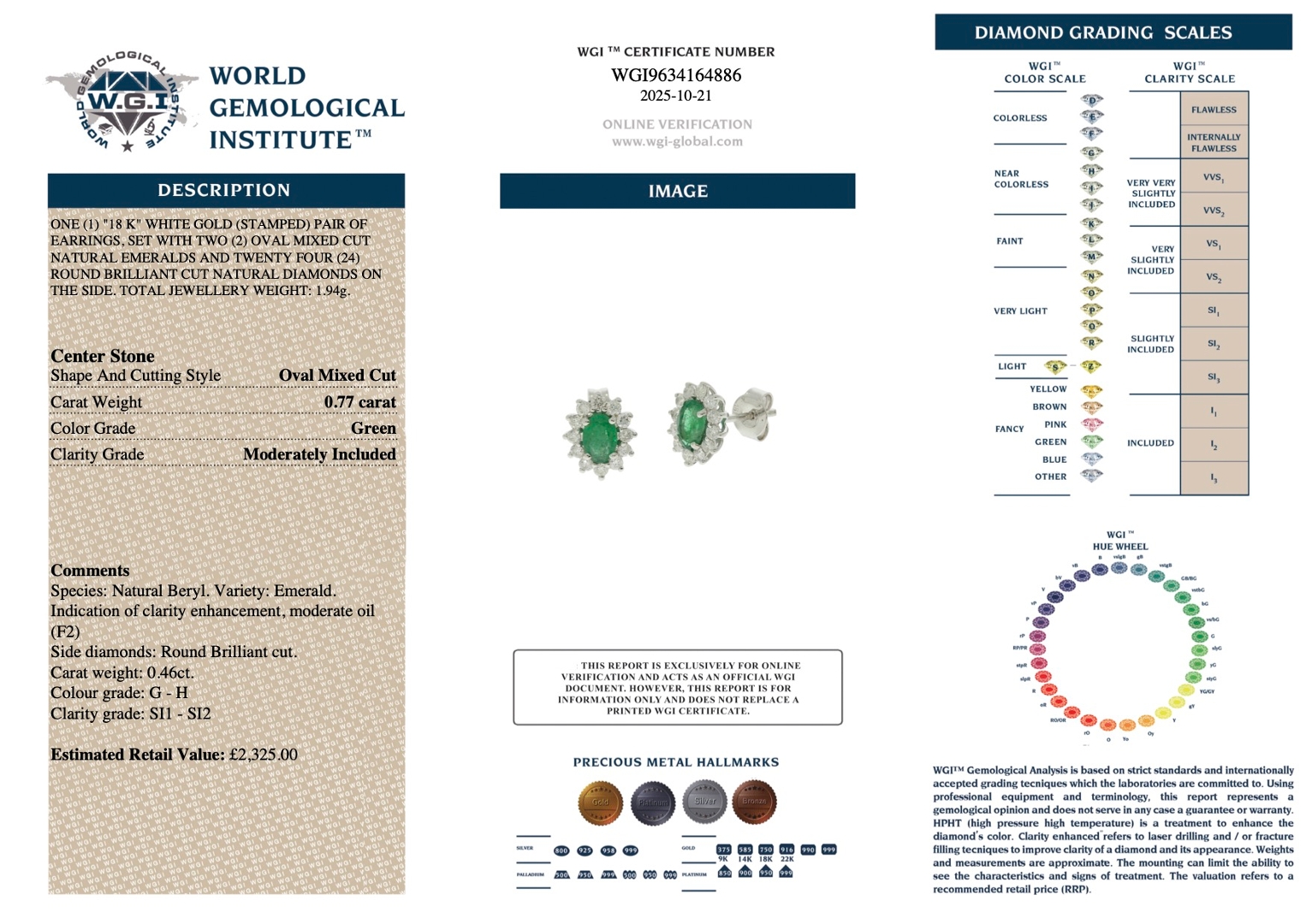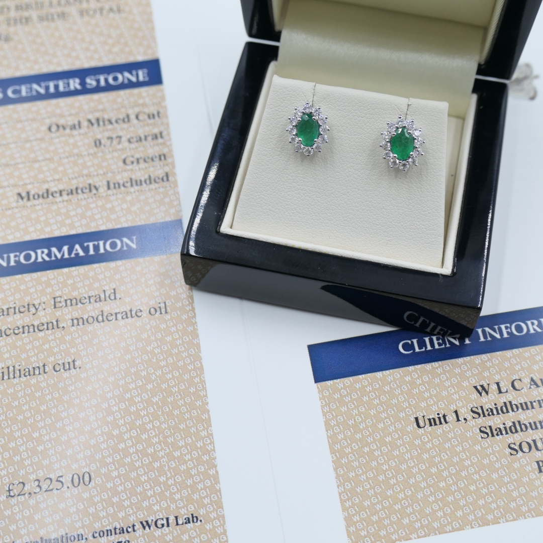 A brand-new, unused certified pair of natural diamond and emerald gemstone cluster earrings, beautifully crafted in 18ct white gold. Each earring features a vibrant oval mixed-cut emerald, together weighing 0.77 carats, showcasing a rich green hue that embodies timeless elegance and sophistication. Surrounding the emeralds is a sparkling cluster of brilliant-cut natural diamonds, totalling 0.46 carats, with G-H colour and SI1–SI2 clarity, providing a refined brilliance that perfectly complements the vivid tones of the emeralds. The sleek white gold setting enhances the cool luminosity of the diamonds while accentuating the deep, natural beauty of the emeralds.