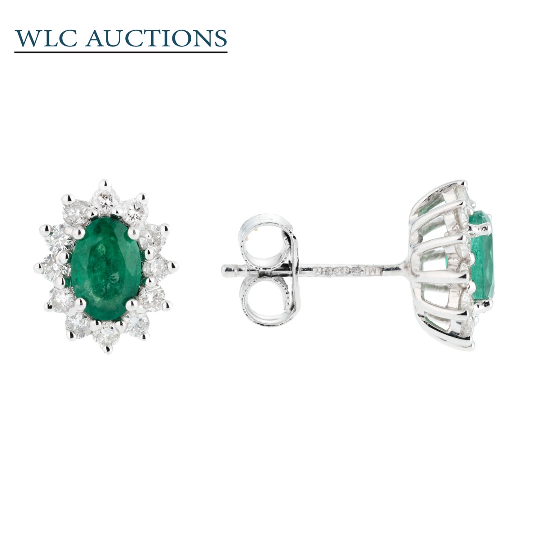 A brand-new, unused, certified pair of natural diamond & emerald gemstone cluster earrings, with two oval-mixed cut emerald gemstones & a cluster of brilliant cut diamonds, set in 18ct white gold.