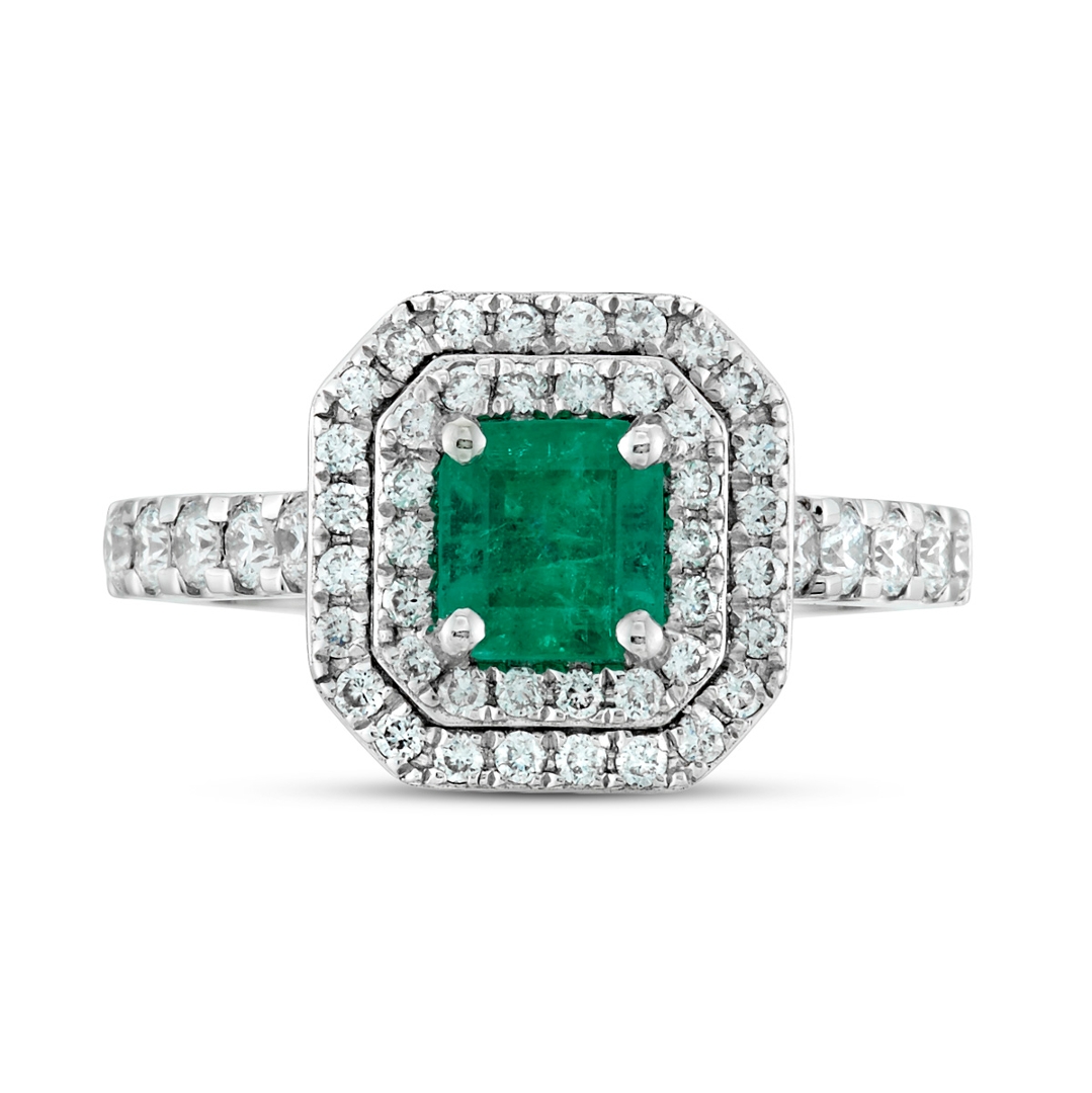A brand-new, unused certified natural diamond and emerald cluster ring displaying a captivating balance of colour, brilliance, and refinement. At its centre sits a 0.79-carat octagonal step-cut emerald of vivid green hue, radiating natural charm and vibrant depth. Surrounding the emerald is a dazzling double halo of brilliant-cut diamonds, extending gracefully along the shoulders to create an exceptional display of sparkle and sophistication. With a total diamond weight of 0.64 carats, graded F–G in colour and VS2–SI1 in clarity, the diamonds beautifully complement the emerald’s rich tone, adding striking contrast and luminosity.