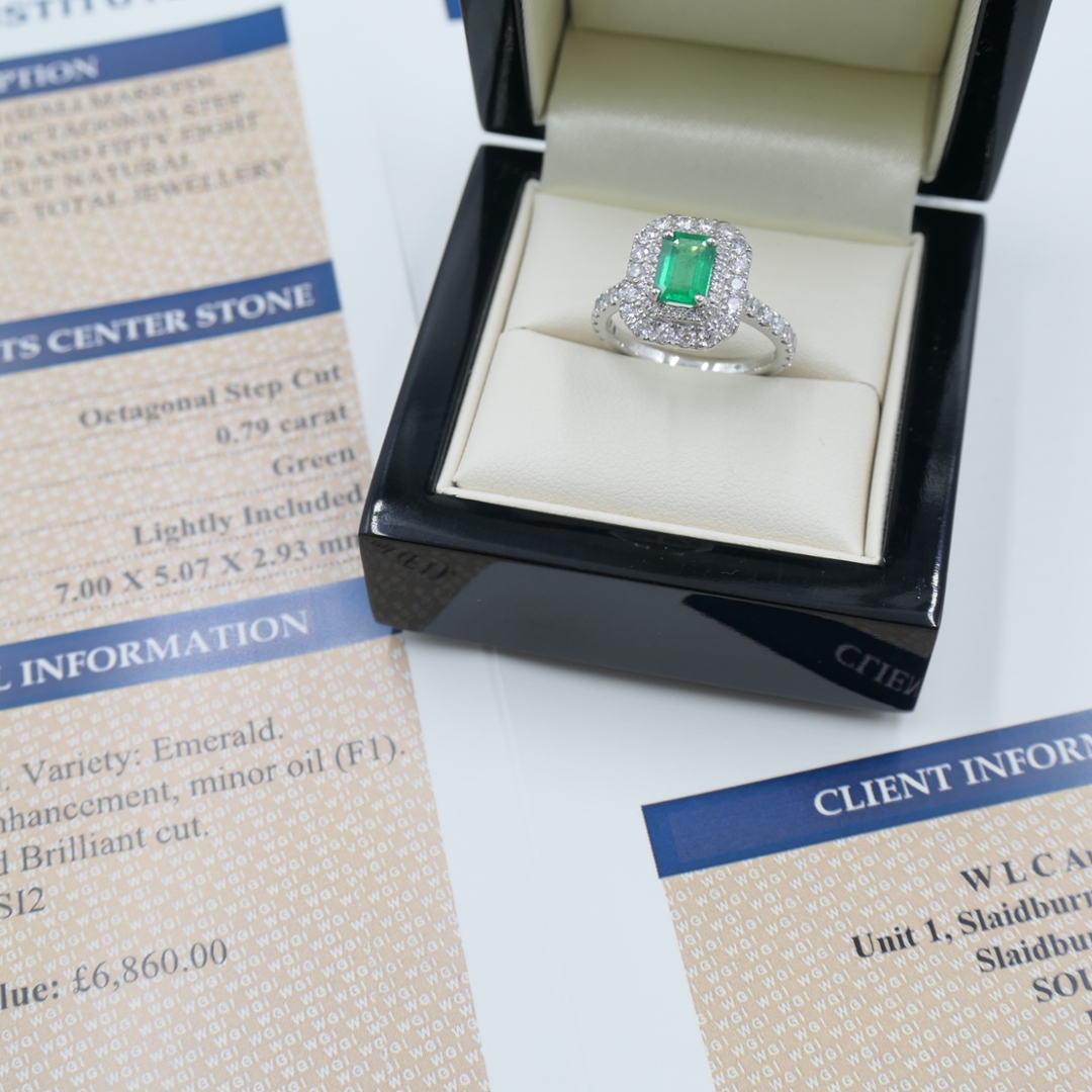 A brand-new, unused, certified natural diamond and emerald cluster ring showcasing a captivating blend of colour and brilliance. The centre features a 0.79-carat octagonal step-cut emerald of vivid green hue, admired for its striking clarity and alluring depth. Surrounding the emerald is an impressive double halo of brilliant-cut diamonds that continues elegantly along the shoulders for maximum sparkle and presence. With a total diamond weight of 1.12 carats, graded F–G in colour and SI1–SI2 in clarity, the diamonds enhance the emerald’s beauty with a radiant, scintillating glow.
