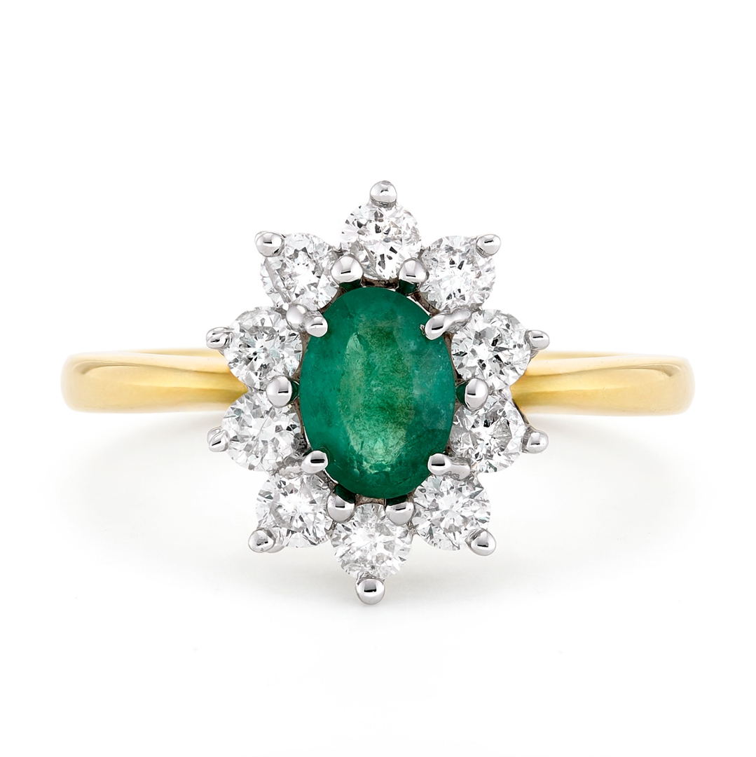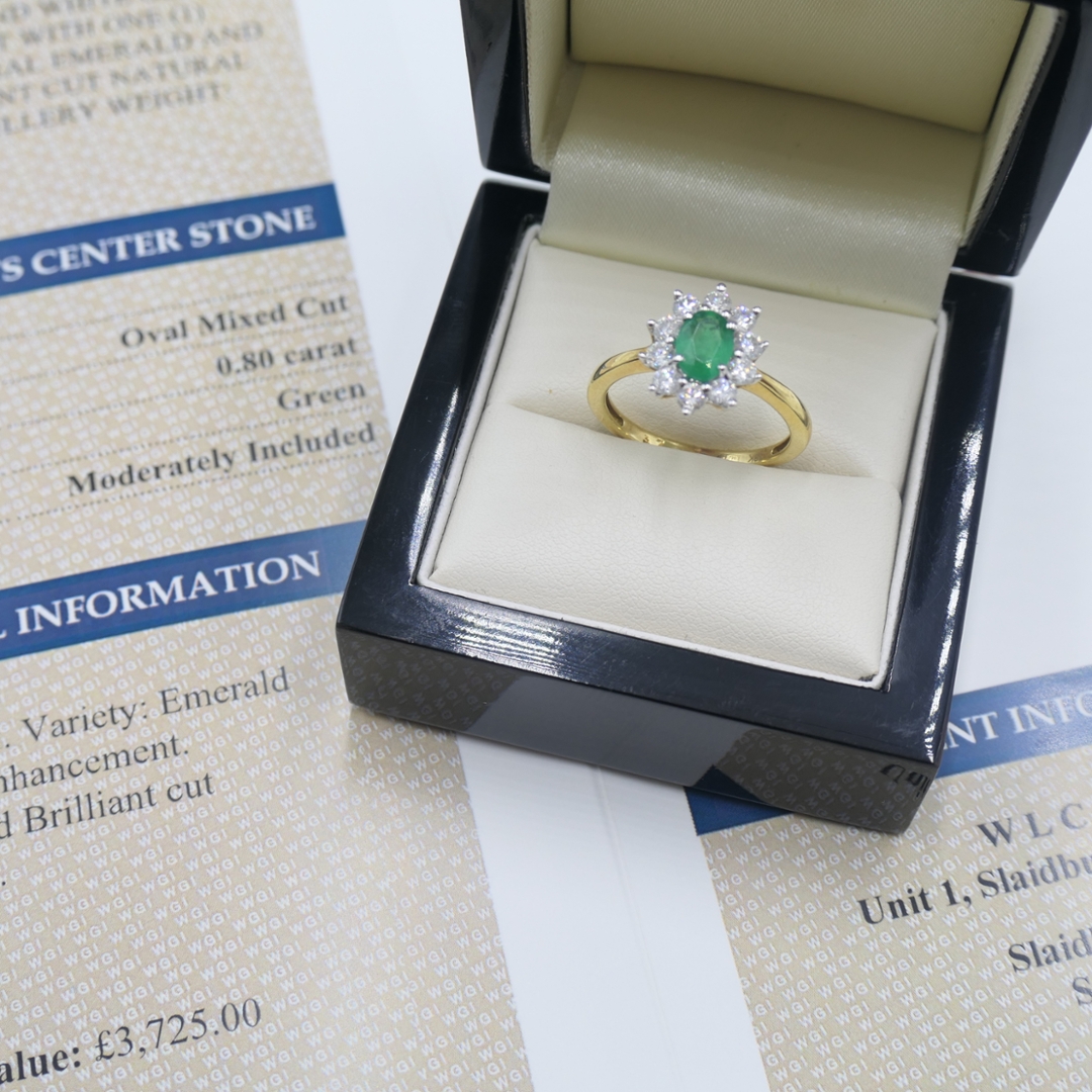 A brand new, unused, certified 18ct yellow & white gold natural diamond & emerald gemstone cluster ring, set with one oval mixed cut emerald gemstone to the centre & a cluster of brilliant cut diamonds in a halo setting.