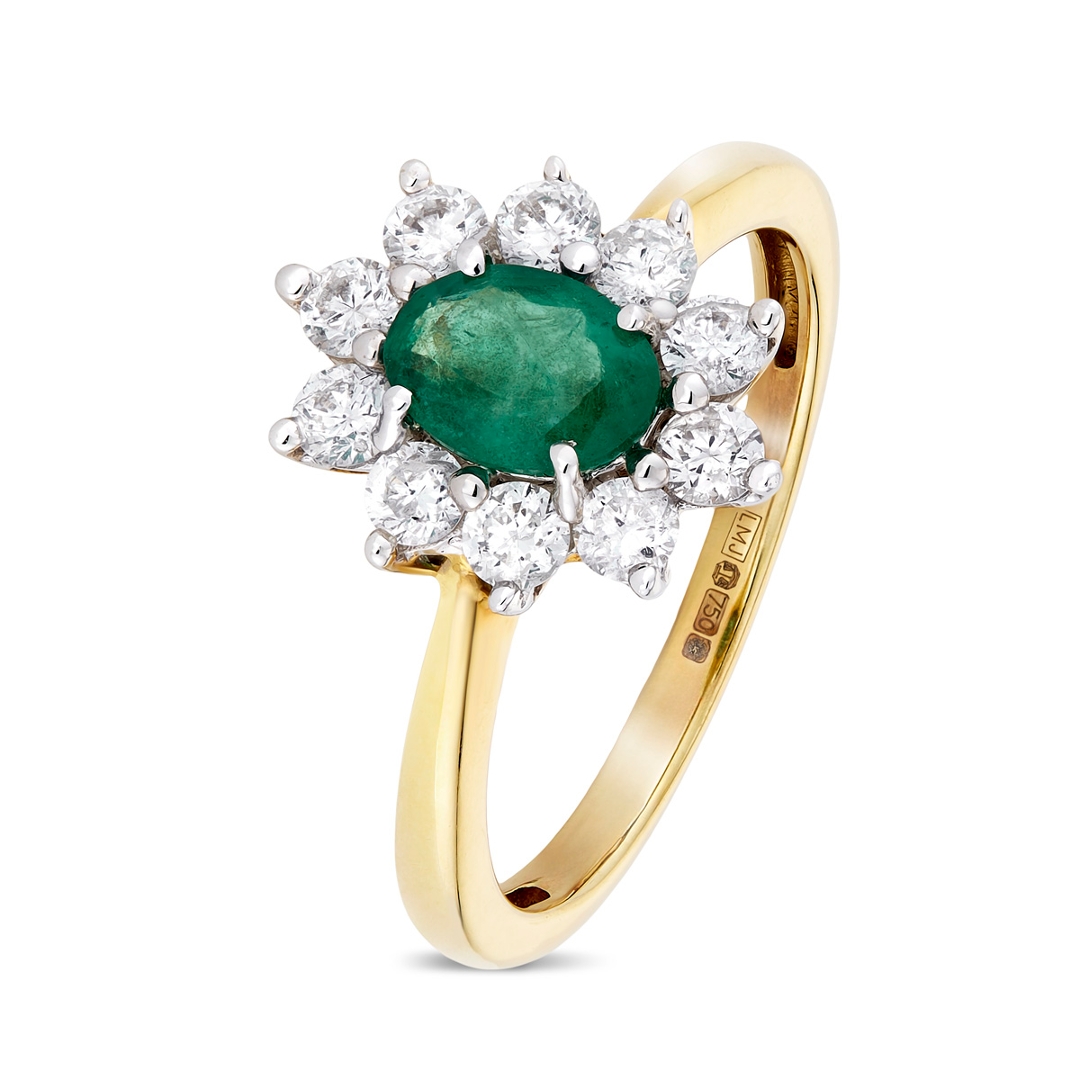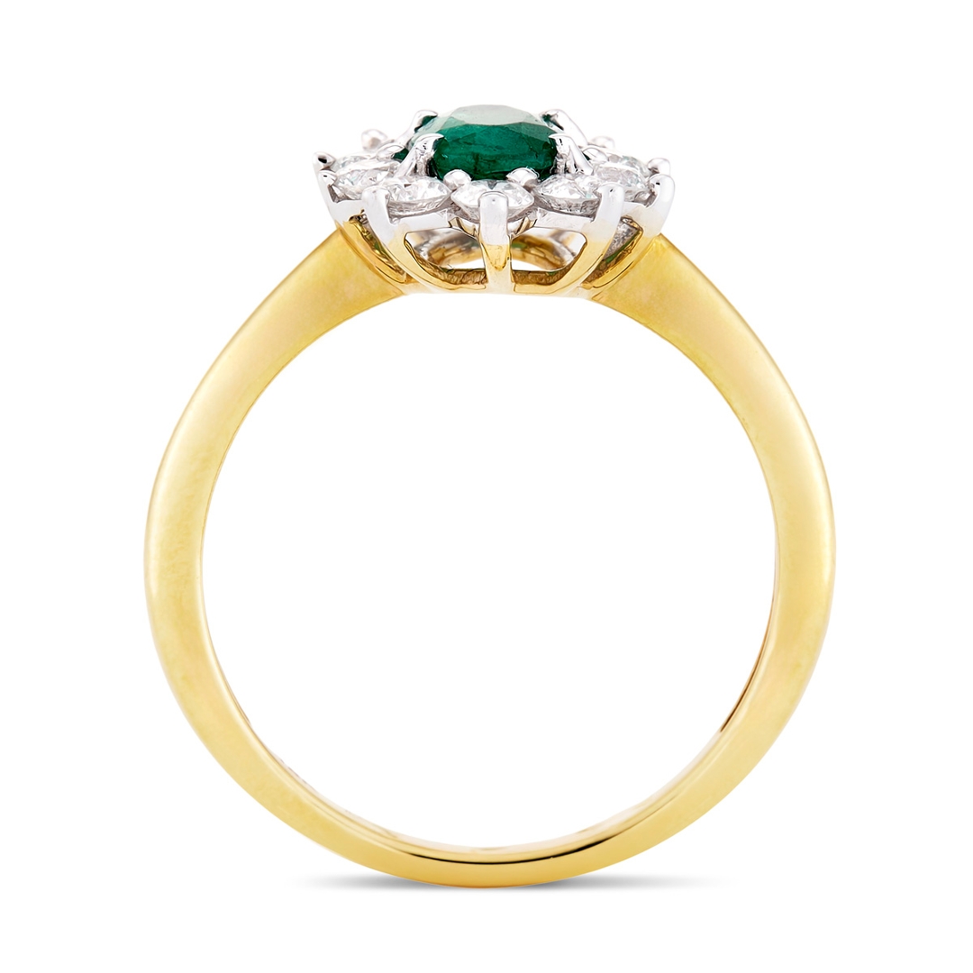A brand-new, unused certified 18ct yellow and white gold cluster ring, this beautiful piece is set with a captivating combination of natural emerald and diamond gemstones. At the centre, an oval mixed-cut emerald, weighing 0.80ct, catches the eye with its vibrant green colour, radiating both elegance and charm. Surrounding the emerald is a halo of brilliant-cut diamonds, totalling 0.70ct, which add a brilliant sparkle and elevate the overall design with their dazzling light.