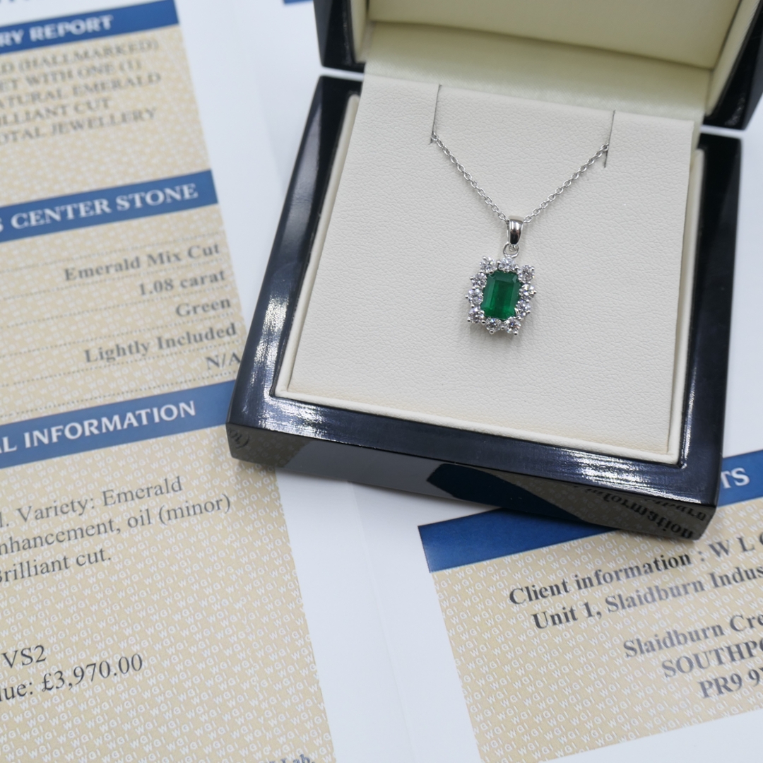 The pendant comes with an 18-inch white gold chain, allowing it to be worn with ease and elegance. This stunning pendant, valued at £3,790.00, embodies exquisite craftsmanship and timeless beauty. Thanks to the enduring appeal of emeralds and diamonds in fine jewellery, it represents a promising investment opportunity.