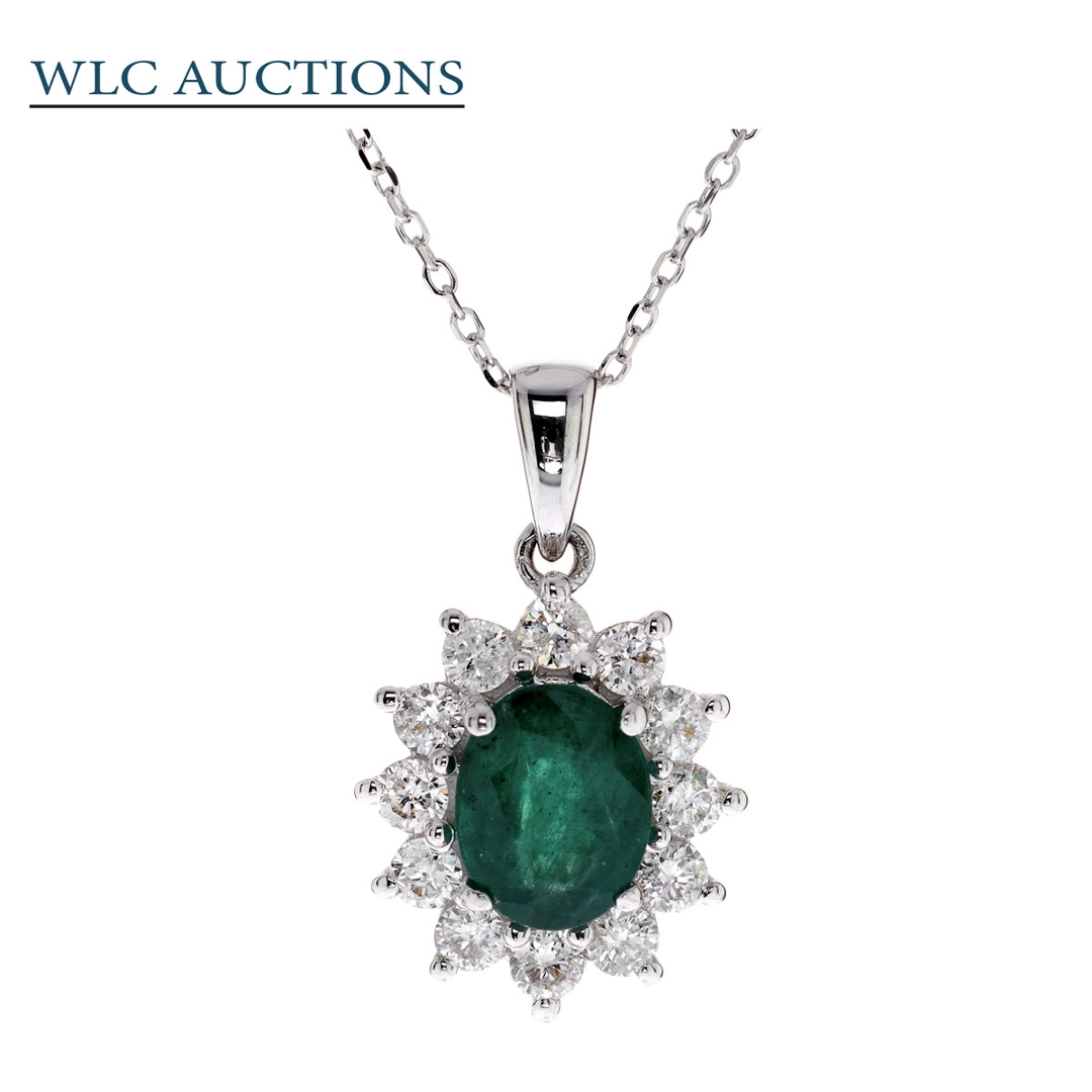 A brand-new, unused, certified natural diamond & emerald gemstone cluster pendant, with one oval mixed-cut emerald gemstone & a cluster of brilliant-cut diamonds, set in 18ct white gold.