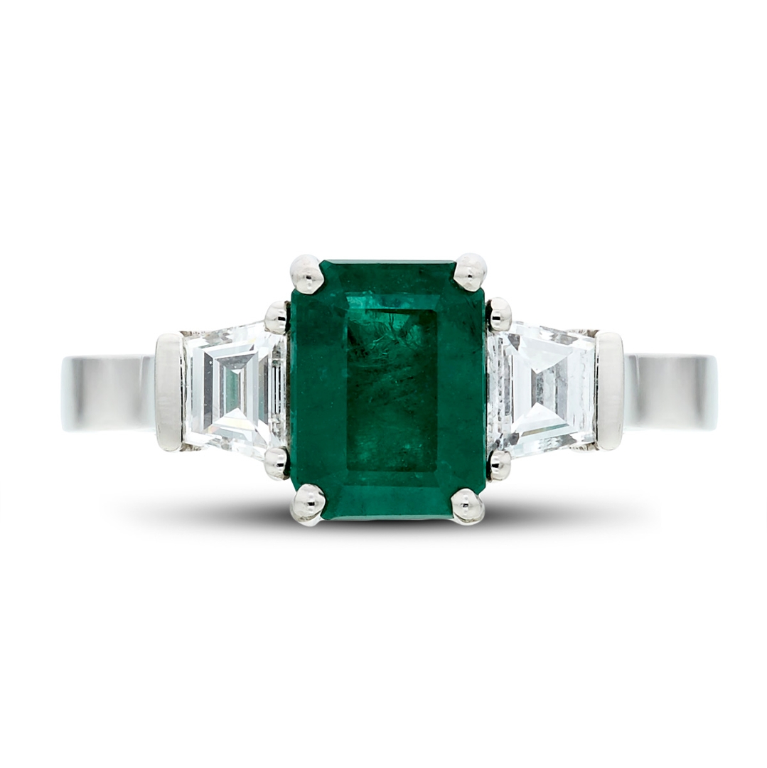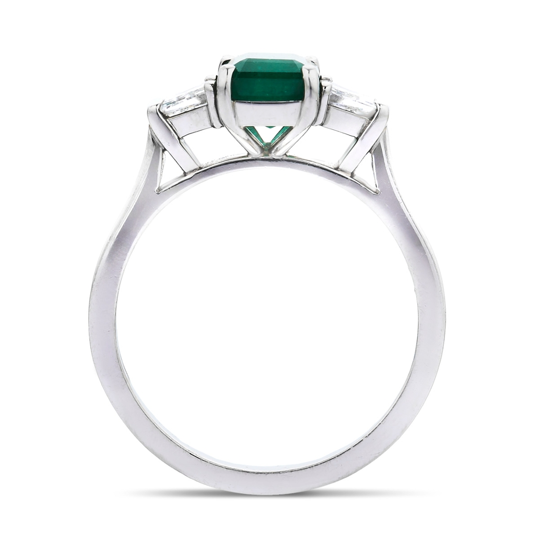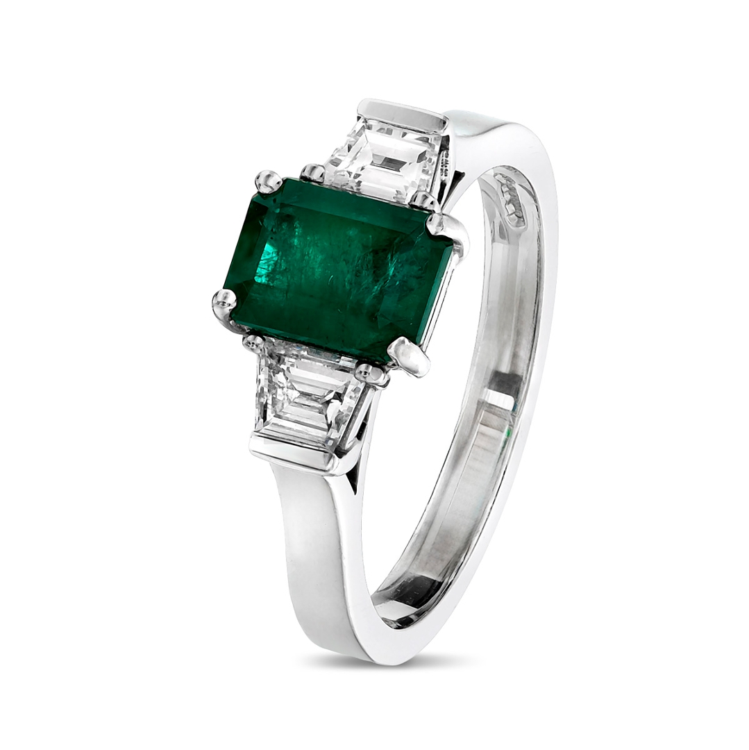 A brand-new, unused, certified natural diamond & emerald gemstone three-stone cluster ring, set with one octagonal step-cut emerald gemstone at the centre & two trapezoid-cut diamonds on the sides, set in platinum.
