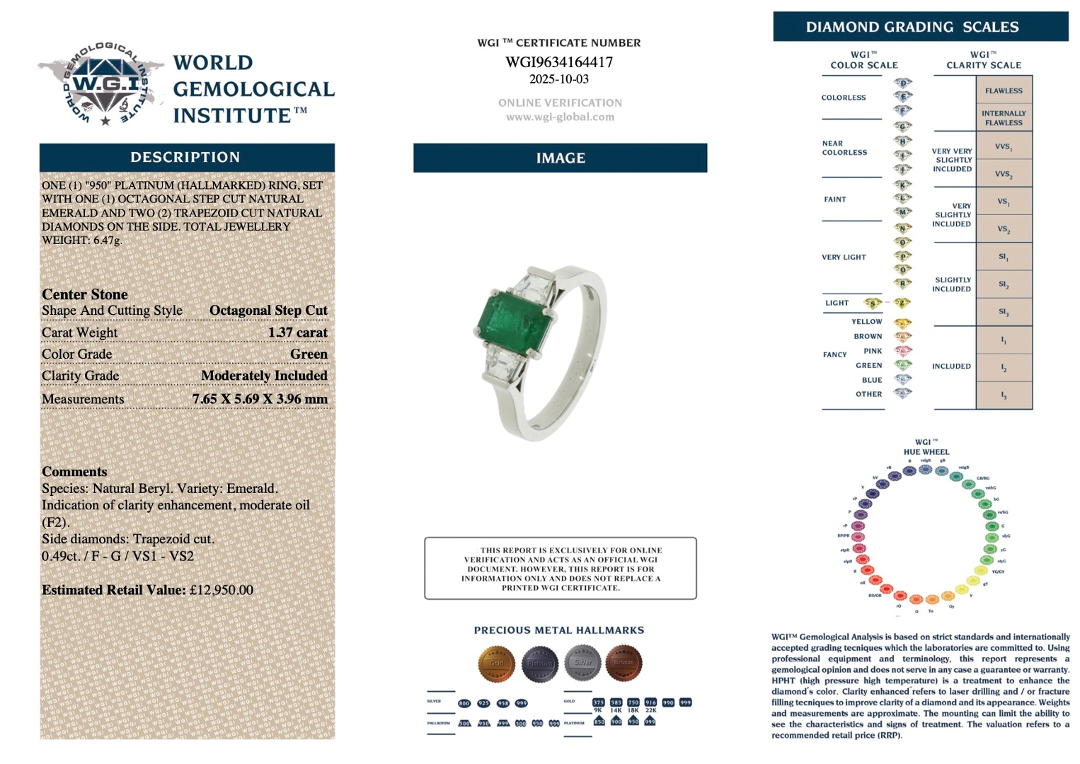 Natural diamonds are celebrated for their enduring brilliance and investment value, while emeralds are treasured for their rarity and distinctive charm. Accompanied by a valuation of £12,950.00, this certified platinum ring embodies elegance, craftsmanship, and the eternal beauty of nature’s finest gemstones.