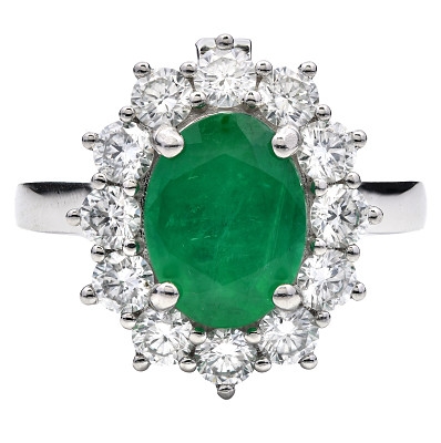 A brand-new, unused, certified natural diamond & emerald gemstone cluster ring, with one oval-cut emerald gemstone at the centre & a cluster of brilliant-cut diamonds in a halo setting, set in platinum.