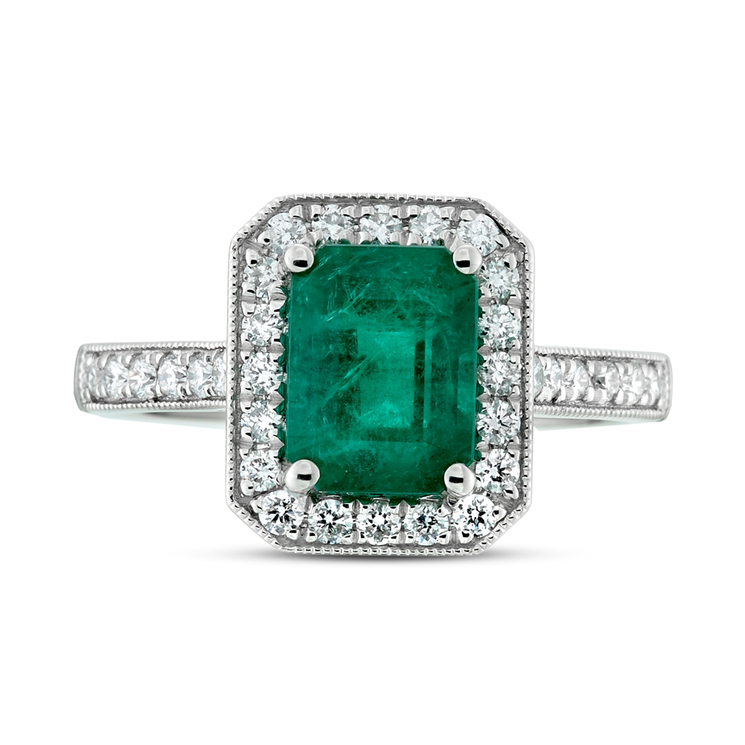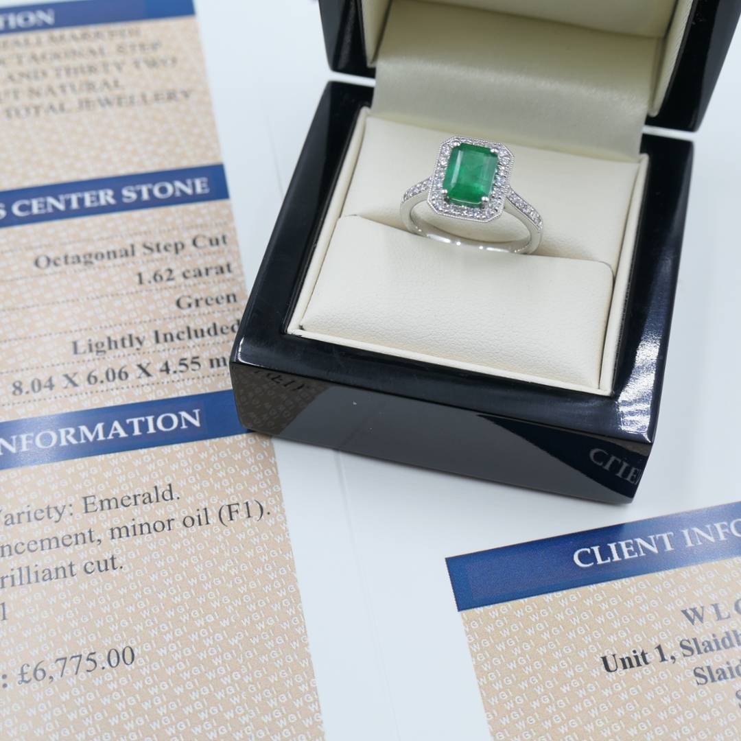 A brand-new, unused, certified natural diamond and emerald cluster ring showcasing timeless elegance and exquisite craftsmanship. At its centre lies a captivating 1.62-carat octagonal step-cut emerald of rich, vibrant green hue, radiating depth and natural brilliance. Surrounding the emerald is a stunning halo of brilliant-cut diamonds that extends gracefully along the shoulders, adding sparkle and sophistication. The diamonds, totalling 0.37 carats, display F–G colour and VS2–SI1 clarity, enhancing the emerald’s vivid tones with exceptional fire and light.
