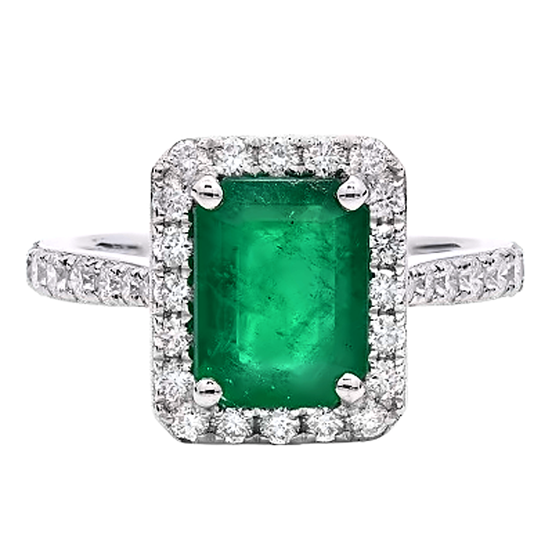 A brand-new, unused, certified natural diamond and emerald emerald-shaped cluster ring, centred with a captivating 1.77ct emerald-cut emerald displaying vivid green colour and elegant step-cut facets. The elongated lines of the emerald cut emphasise clarity and depth, creating a refined focal point with striking presence on the hand. Surrounding the centre stone is a halo of brilliant-cut natural diamonds, carefully arranged to frame the emerald and accentuate its rich tone.